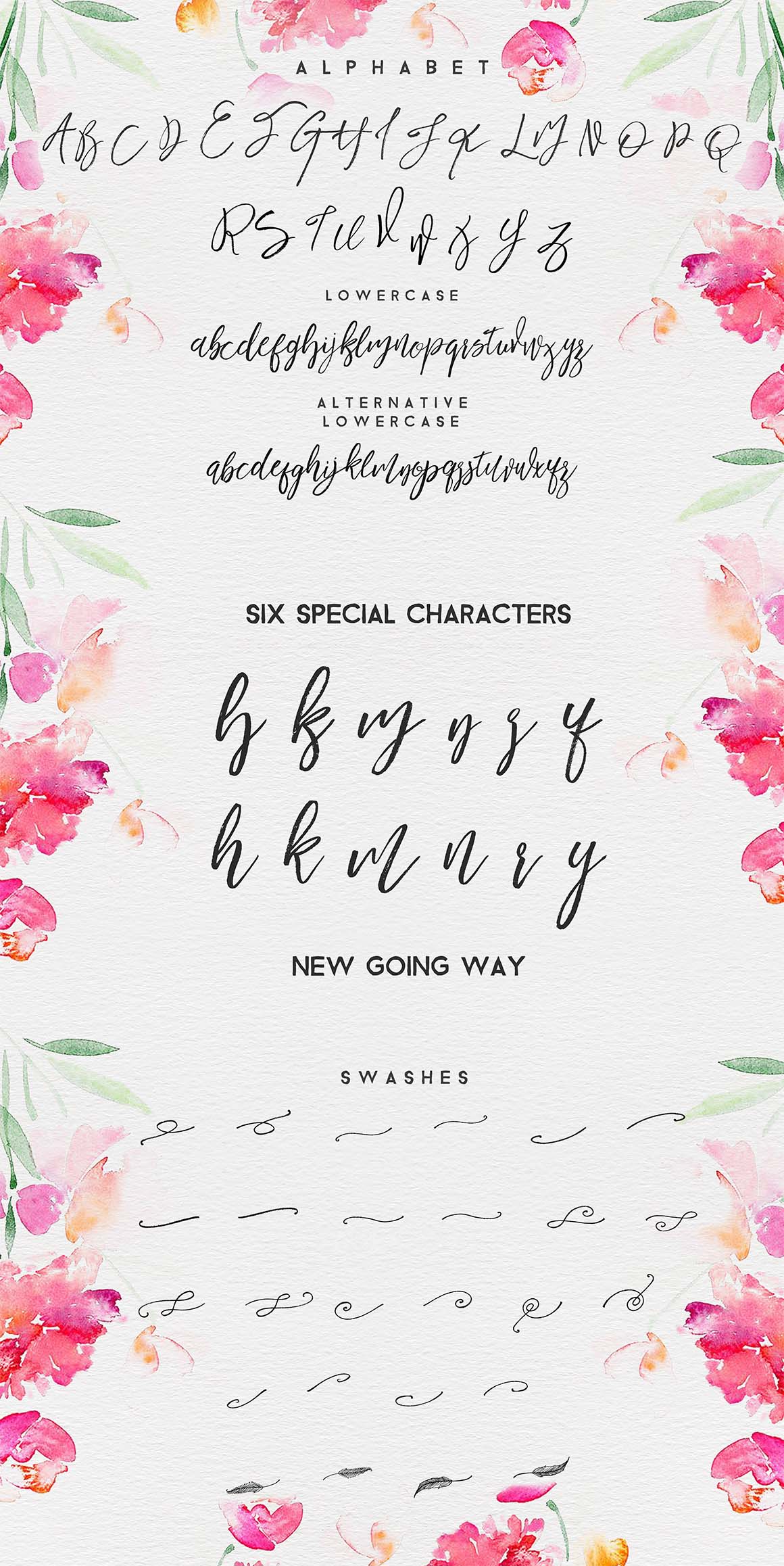 Michaela Script is modern hand brushed script, organic, fun with dancing baseline. Different alternates and swashes to the beginning and ends of all lowercase.