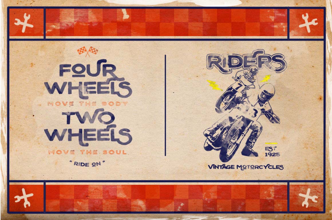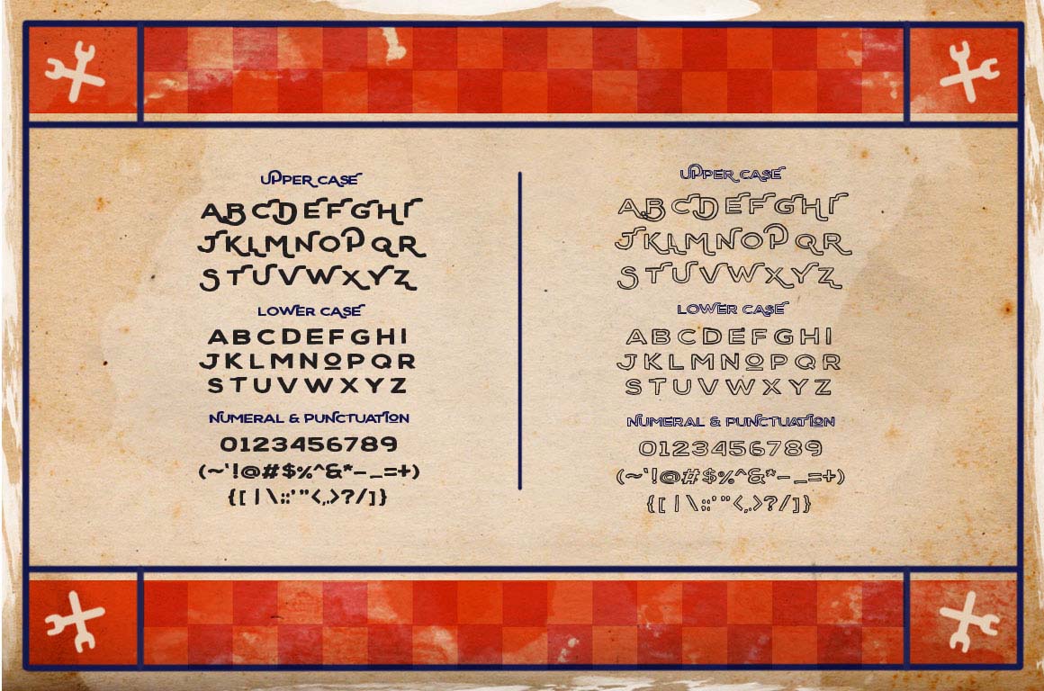 A hand-made sans serif (All caps) including regular and outline styles. inspired from vintage motorcycle custom culture, machine, retro, classic, art deco, and grunge.