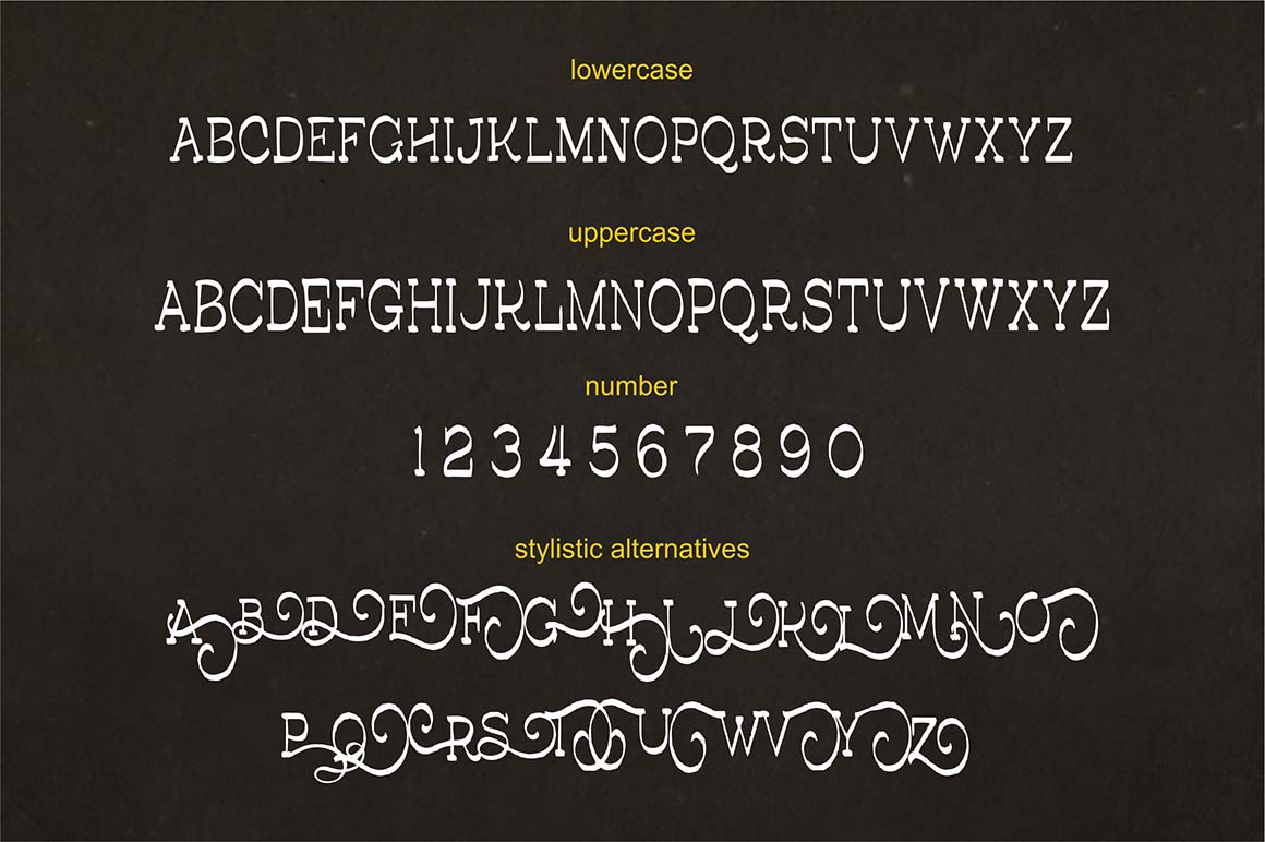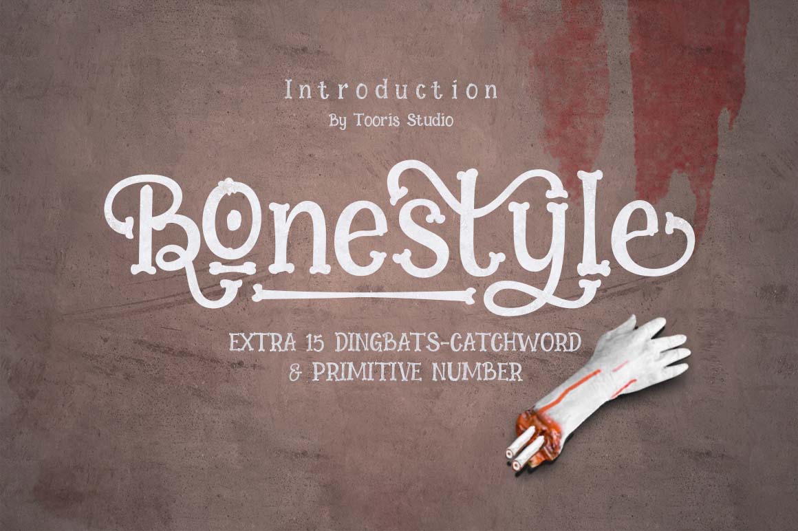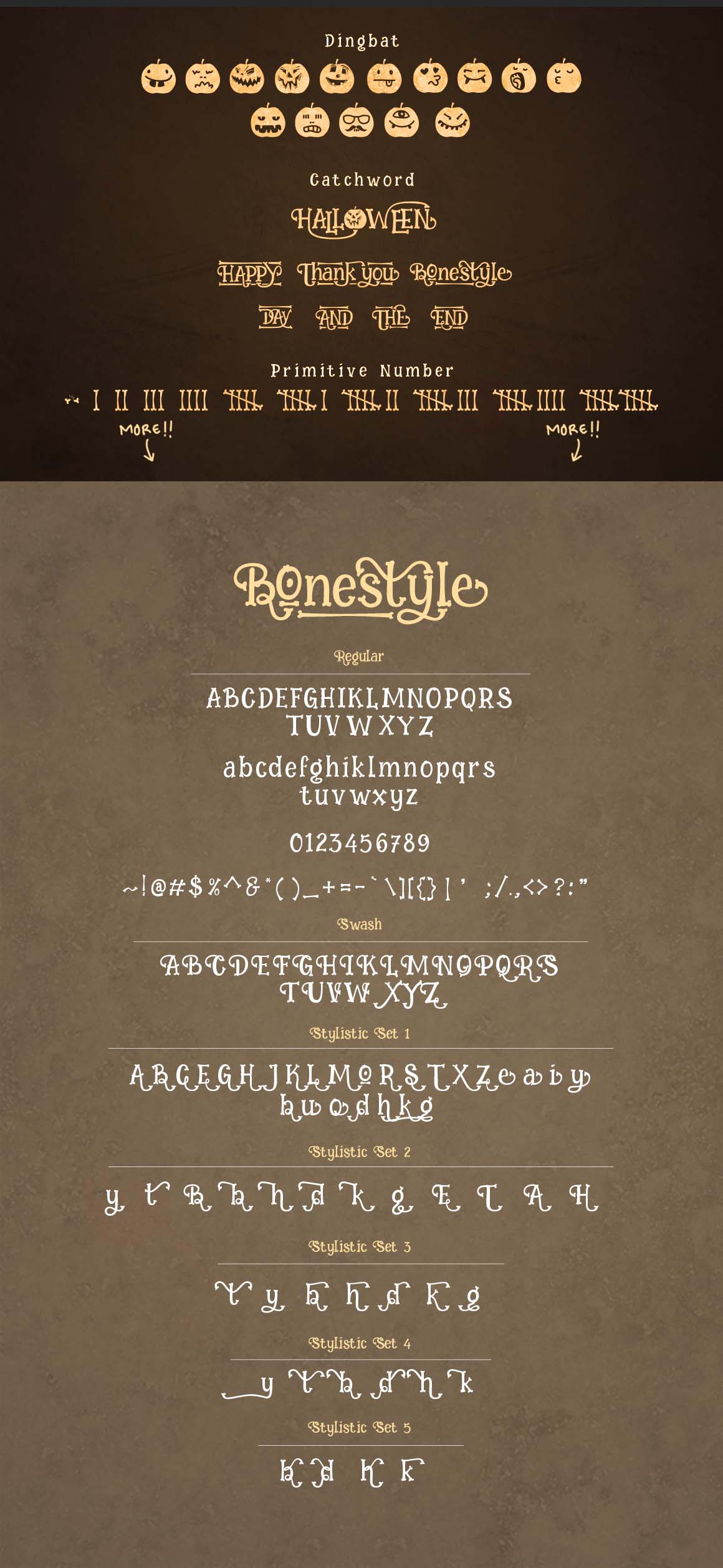 Bonestyle is like a bone font display for Halloween and of course the font can still be creative in a wide variety of display needs, suitable for display. There are 304 glyphs in a font including stylistic sets, ligatures, Swash. OpenType features the Stylistic set in some of the characters that allows you to mix and match pairs of letters according to your design. To access alternate glyphs, you need a program that supports OpenType features such as Adobe Illustrator CS and Adobe Indesign.