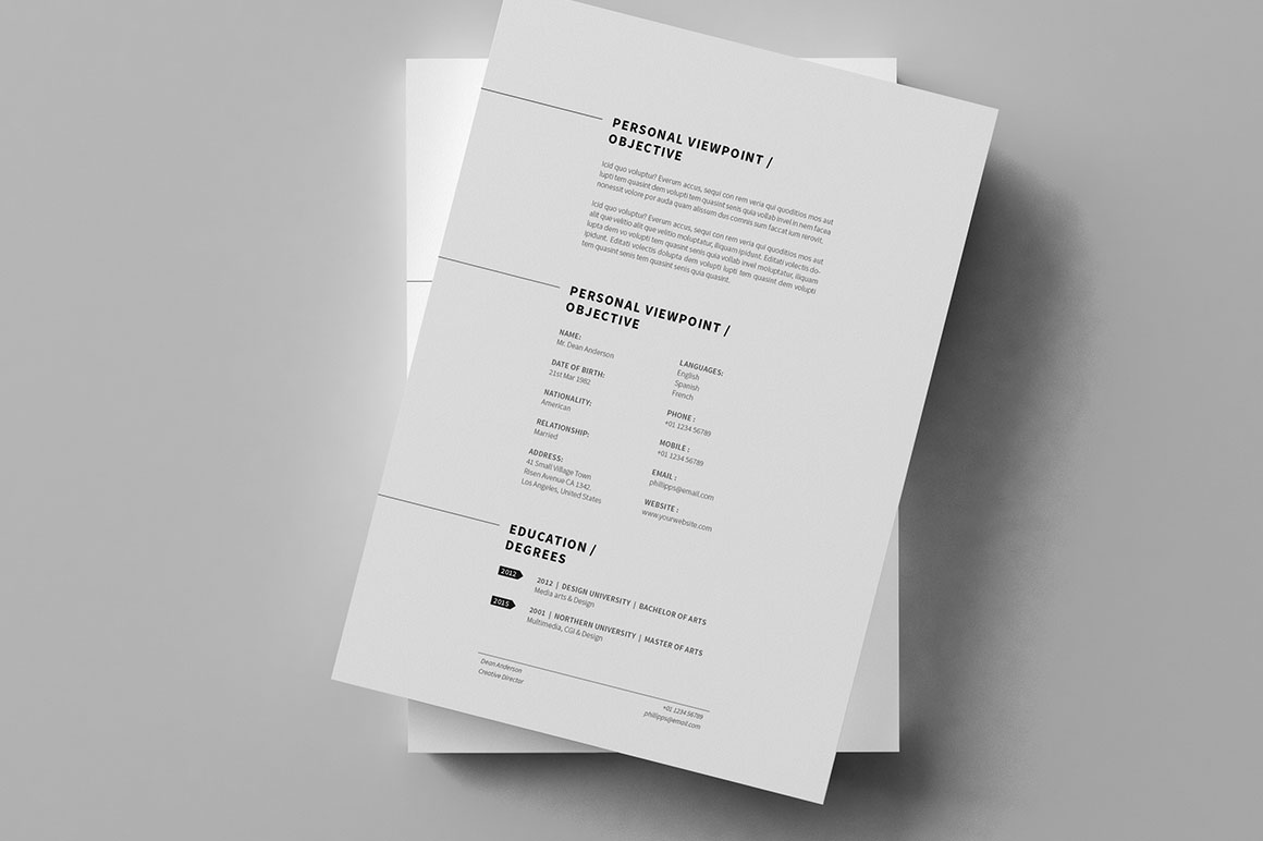 The Minimal Resume template is an Indesign, Photoshop and Illustrator template for individuals working in creative fields that require adding images to their written CV. What will you get? 2 sizes: A4 (210 x 297 mm) & US letter (8.5 x 11 inch) + bleeding Adobe Indesign Documents (.indd, .idml) for Editing in Indesign CS4 to CC Adobe Photoshop Documents (.psd) Adobe Illustrator Documents (.ai, eps).