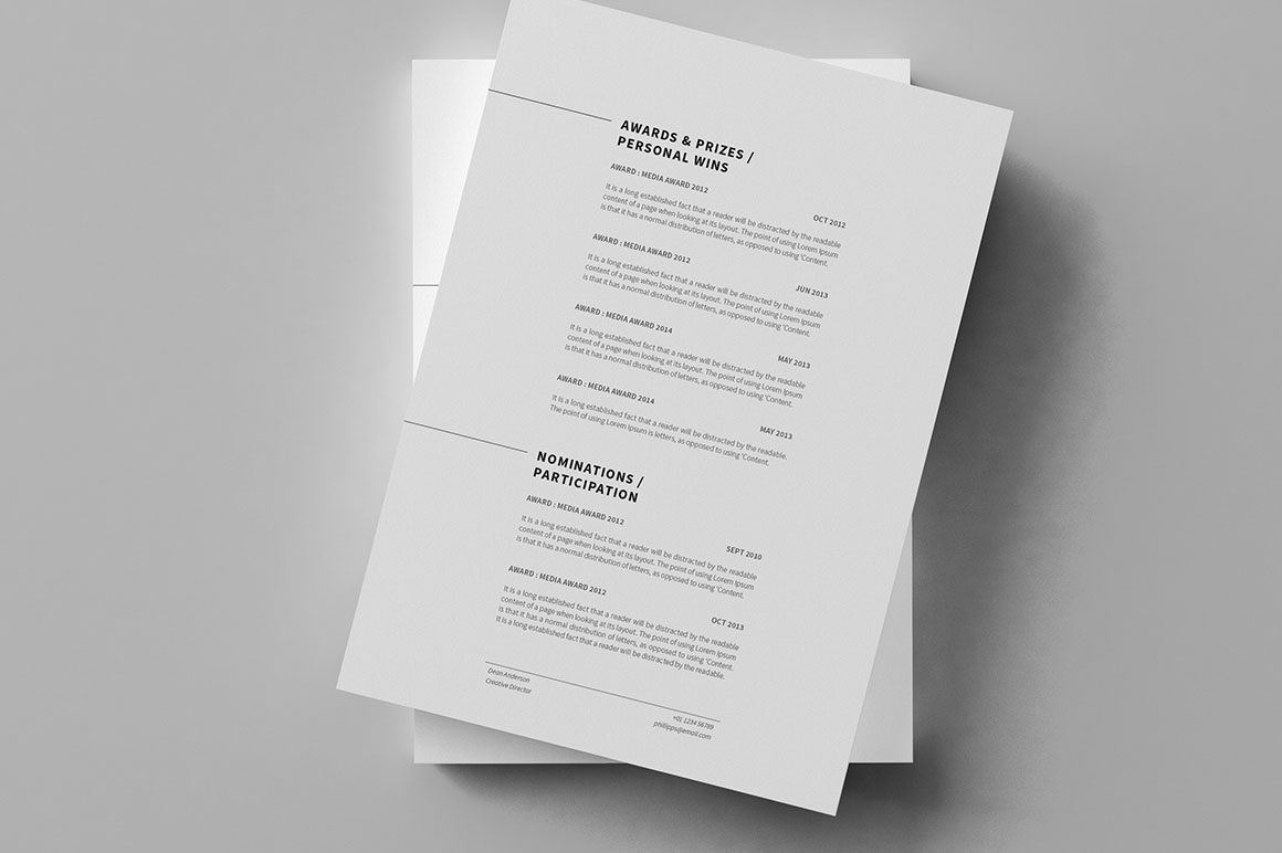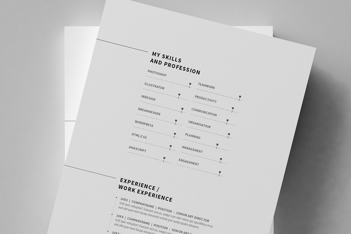 Minimal Resume template with 104 Files in one Package! The Minimal Resume template is an Indesign, Photoshop and Illustrator template for individuals working in creative fields that require adding images to their written CV. What will you get? 2 sizes: A4 (210 x 297 mm) & US letter (8.5 x 11 inch) + bleeding, 4 Adobe Indesign Documents (.indd, .idml) for Editing in Indesign CS4 to CC, 2 Adobe Photoshop Documents (.psd), 24 Adobe Illustrator Documents (.ai, eps), 48 Microsoft Word Documents (.docx, doc), 24 Apple Pages Documents (.pages), 2 Adobe PDF Files for detailes Preview (.pdf).