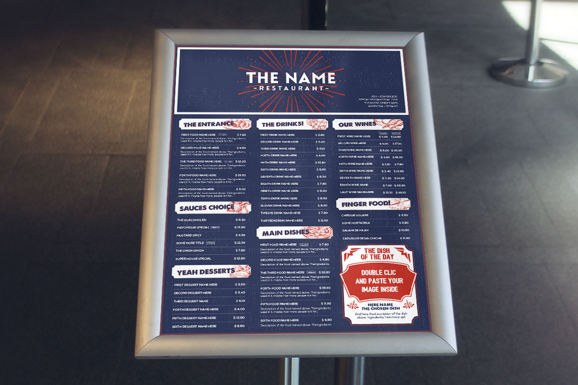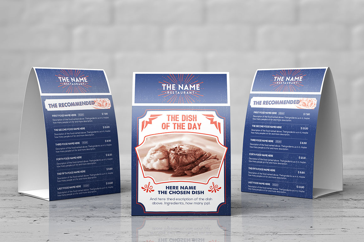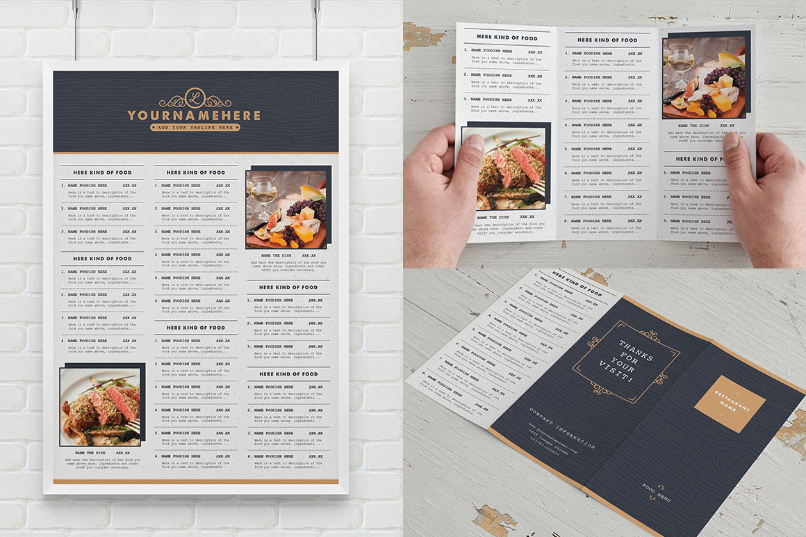 Multipurpose food menu template for your restaurant. Features: A4 tri-fold menu, A3 Menu Poster (Resizable to a4), Table tent, Personal card, Logo included, Very Easy to add your own text and image, Bleeds: 5mm, CMYK. Print Ready, Free fonts used, Illustrator file: .Ai and .Eps