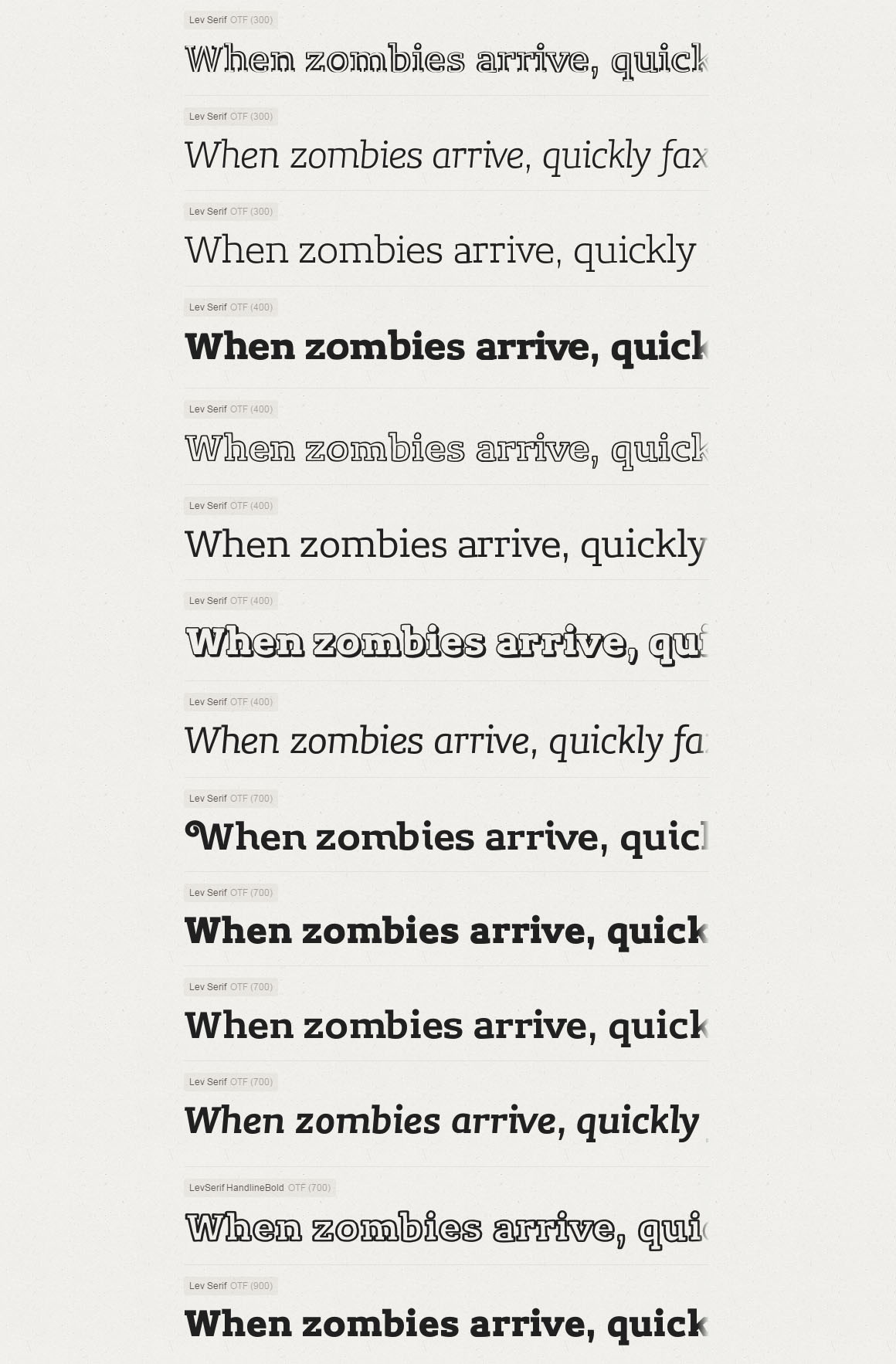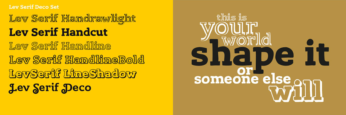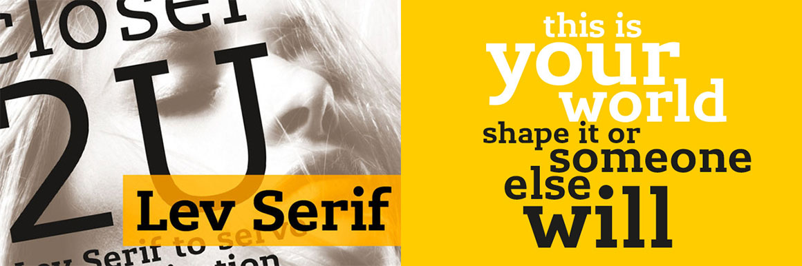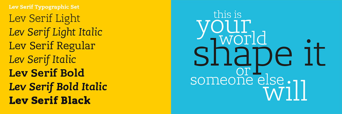 Lev is a slab serif font, the rectangular serifs and the straight angled shoulders and links contrasting the curves and loops. Lev Serif is characterized by thick, block-like serifs. Lev is designed by Leon Hulst. 14 high quality fonts.