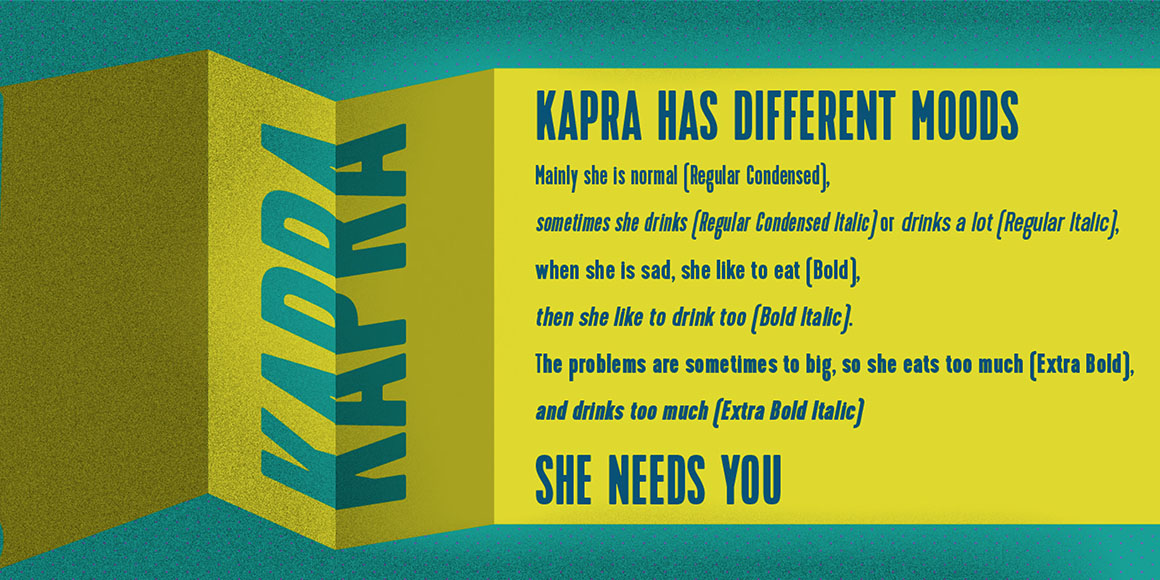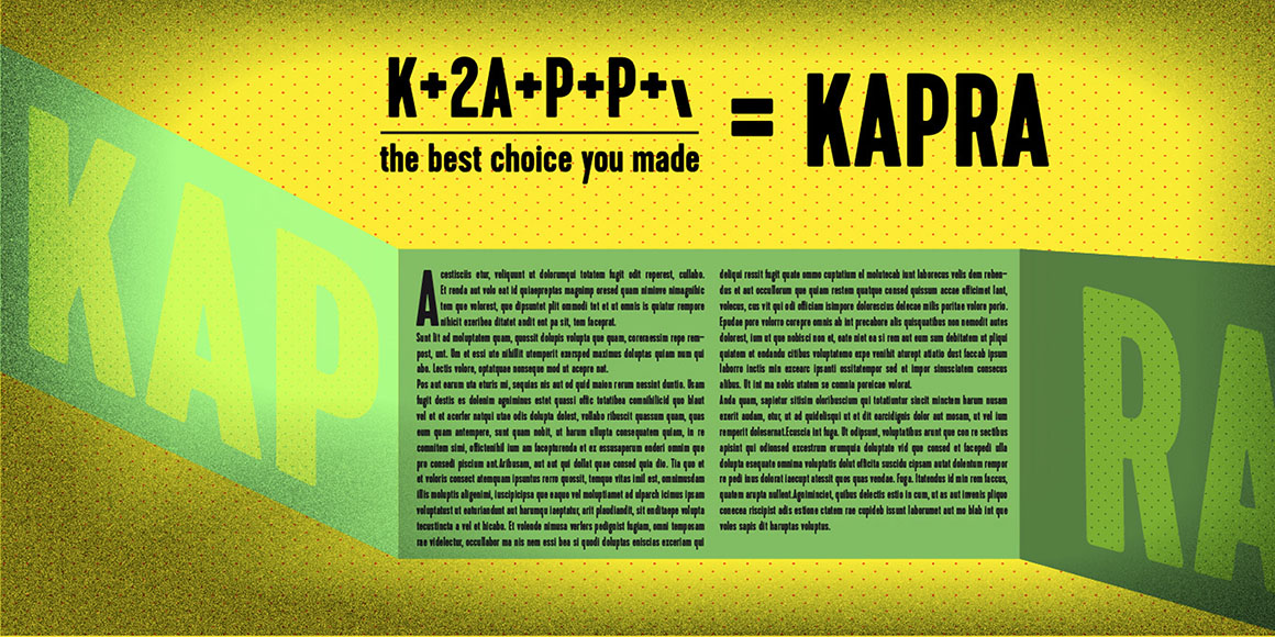 To design a font Kapra, I was inspired by a You And Me Monthly published by National Magazines Publisher RSW „Prasa” that appeared from Mai 1960 till December 1973 in Poland. The font Kapra is designed in eight versions – lower and uppercase characters.