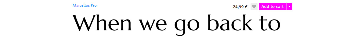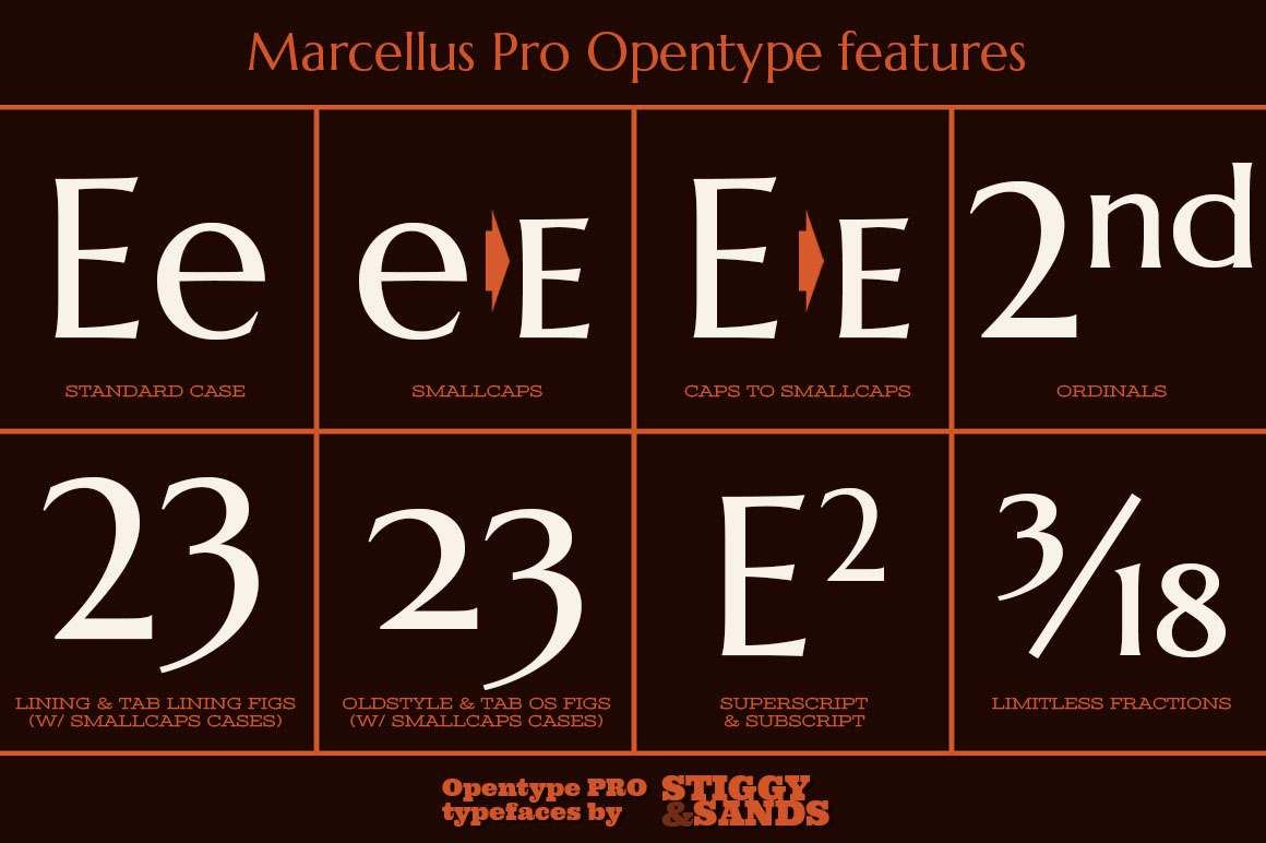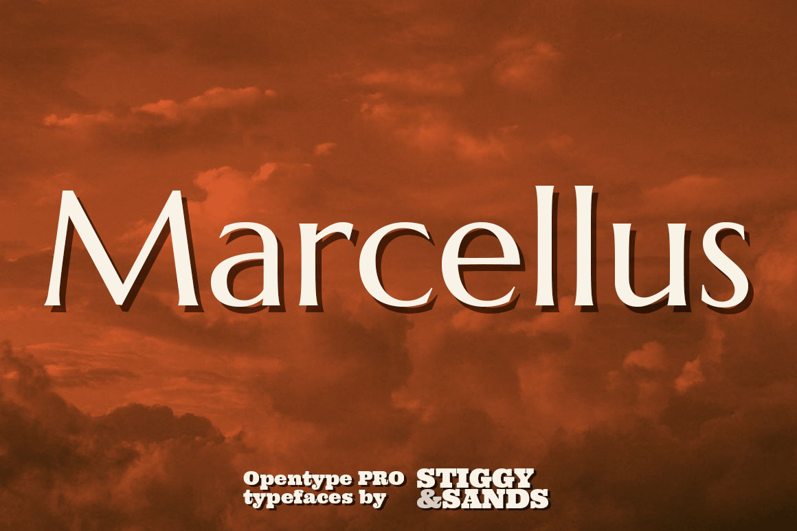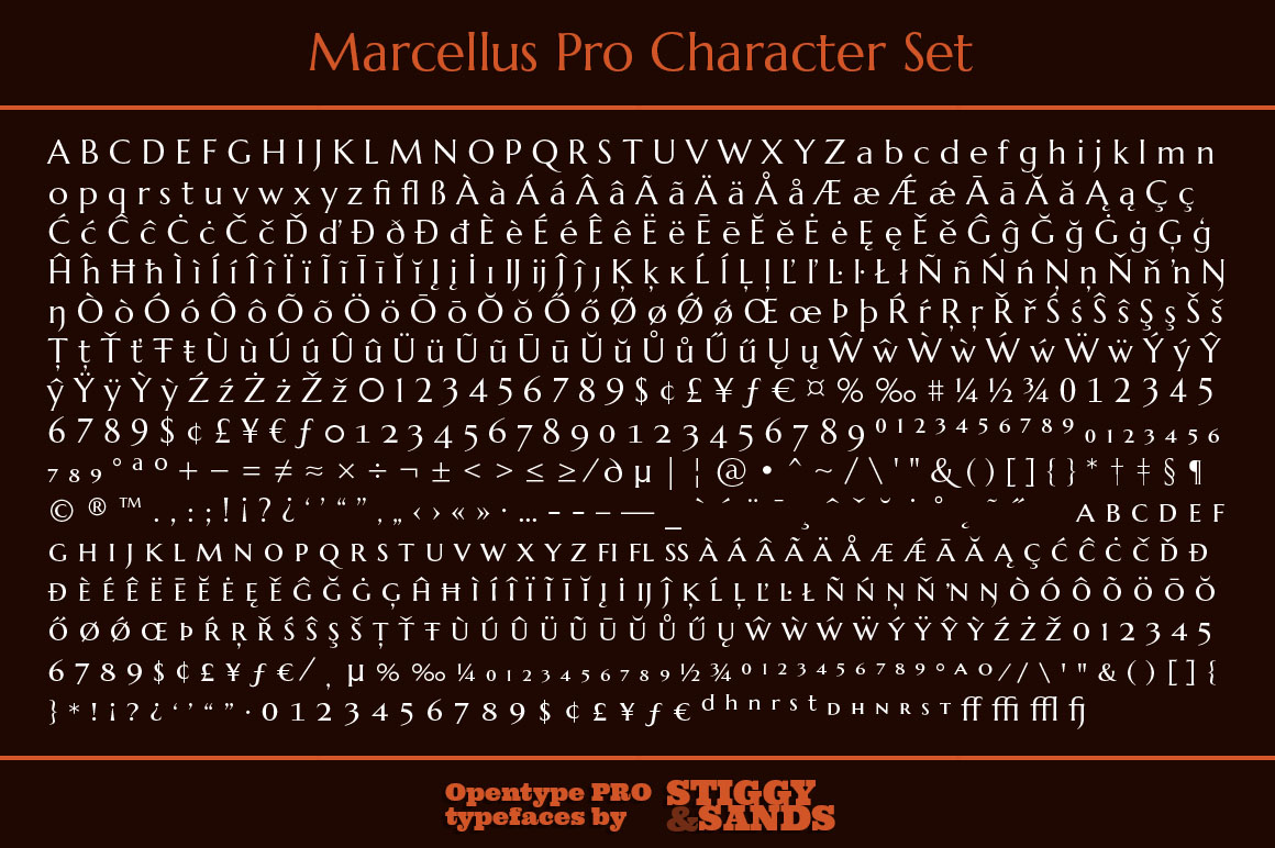 Classic Roman inscription letterforms are the base influence for Marcellus Pro, but as the expansion of the glyph set took place, it evolved into a gorgeous flare-serif typeface, rich with presence and usability. Lowercase and SmallCaps characters can be used individually or in combination settings for a diverse range of looks. The functionality of this single typeface feels more like that of a font family. Opentype features include: SmallCaps, Full set of Inferiors and Superiors for limitless fractions, Tabular, Proportional, and Oldstyle figure sets (along with SmallCaps versions of the figures), Stylistic Alternates for Caps to SmallCaps conversion.