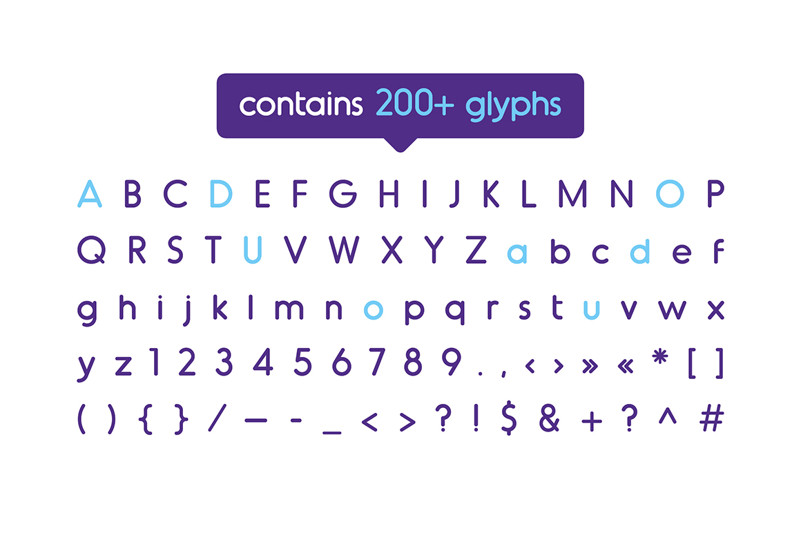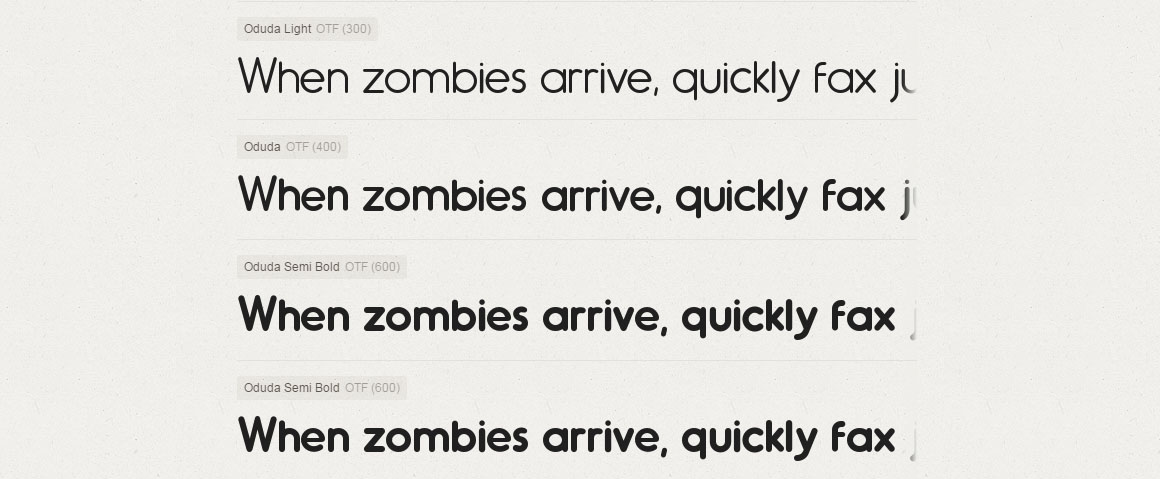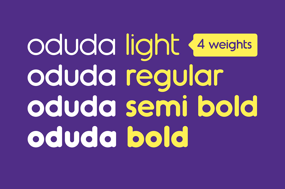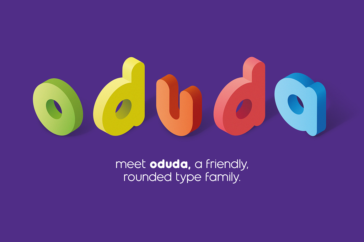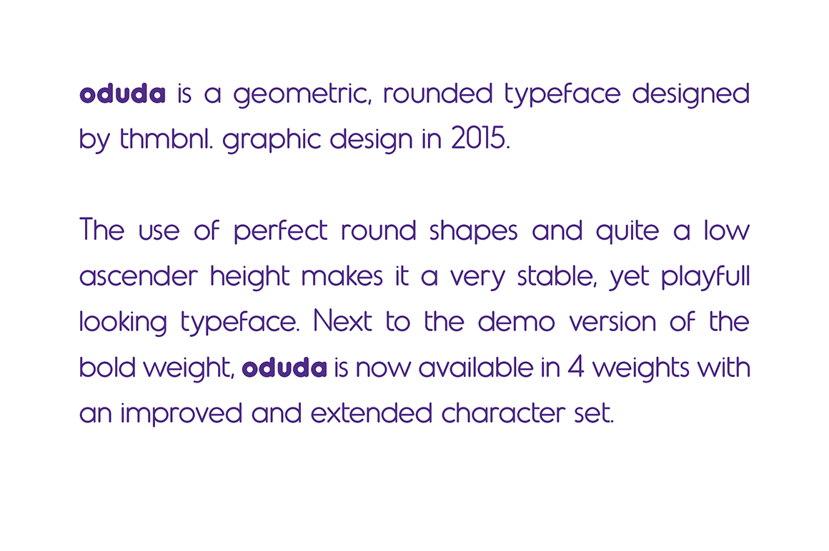 oduda is a geometric, rounded typeface designed by thmbnl. graphic design in 2015. The use of perfect round shapes and quite a low ascender height makes it a very stable, yet playfull looking typeface. Next to the demo version of the bold weight, oduda is now available in 4 weights with an improved and extended character set. This package contains OTF files and supports webfonts.
