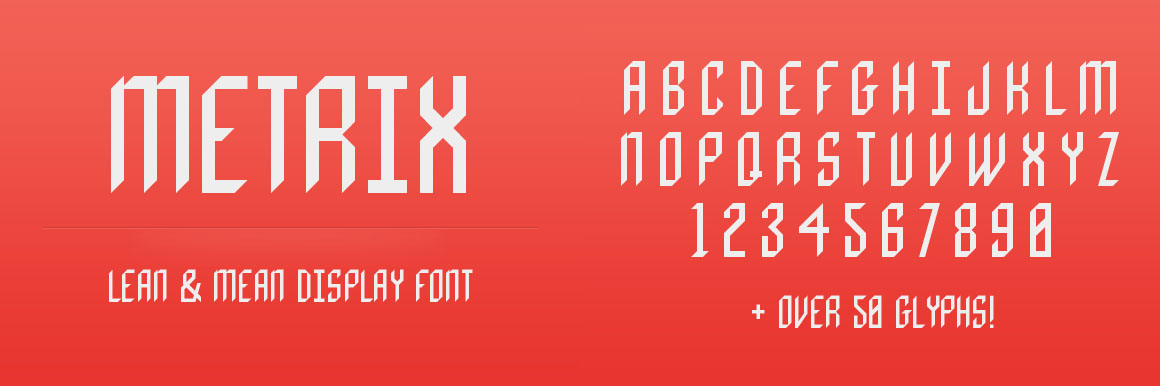 Metrix is a geometric display font with over 50 glyphs. The design was inspired by some old type on the cover of a book I found from the 1950’s. This font pairs well with many script fonts.