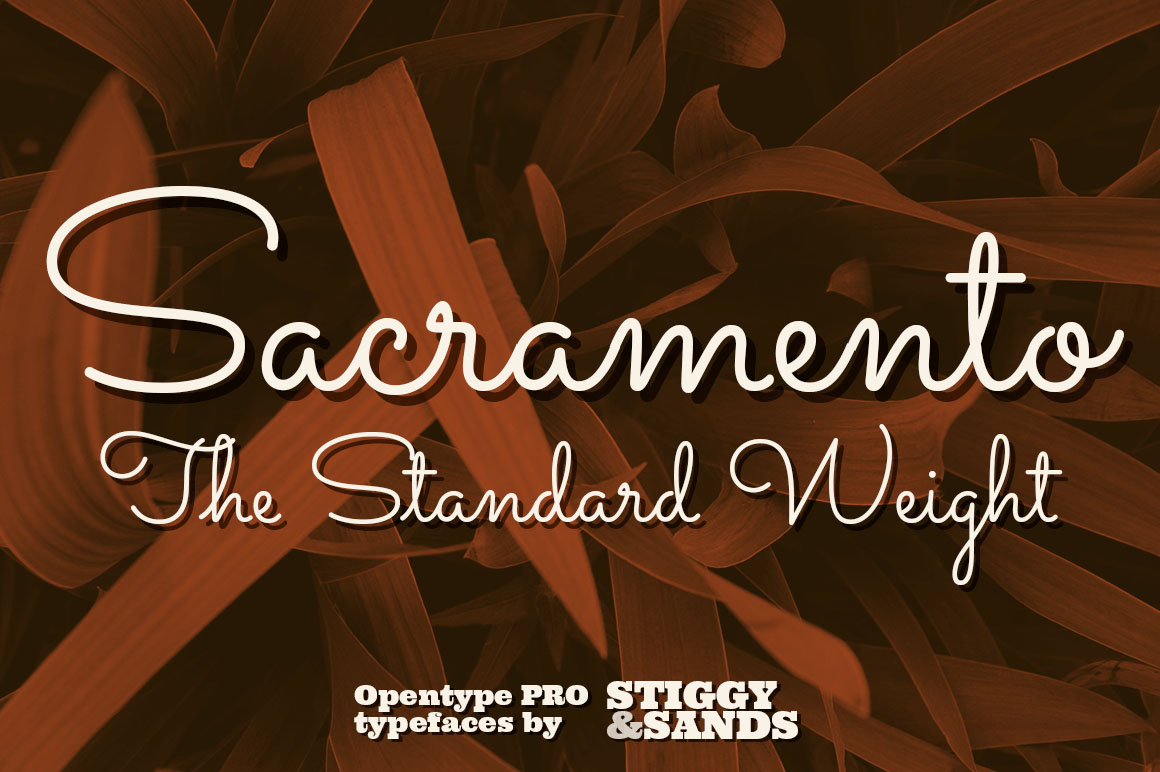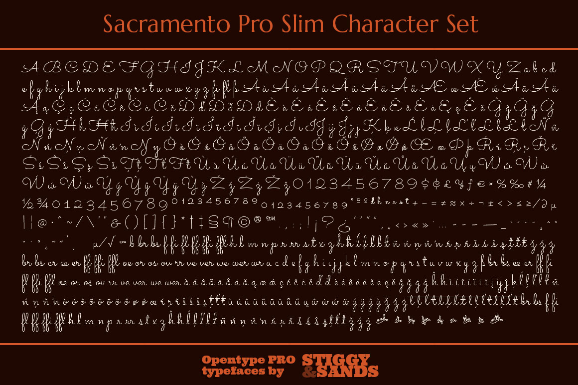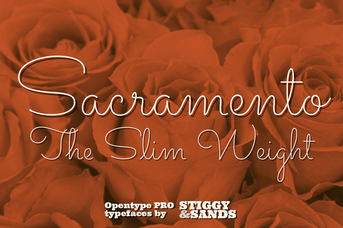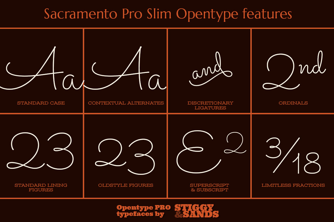 The Sacramento family of typefaces was inspired by a monoline, semi-connected script from hand-lettering artist brochure work of the 1950’s and 1960’s. With its sophisticated upright stance, it stands on a thin line between formal and casual lettering styles, yet it has a commanding presence for headlines and titles. The Slim adds a fine pen-line style, while the Stout style expands the formal/casual dichotomy much further than the original weight. Opentype features include: Contextual Alternates for initial and final forms, Stylistic Alternates for an alternate lowercase t, Discretionary Ligatures* for catch words like “and”, “at”, “by”, “for”, “of”, “or”, “the”, “to”, and “with”, Full set of Inferiors and Superiors for limitless fractions, Proportional and Oldstyle figure sets.