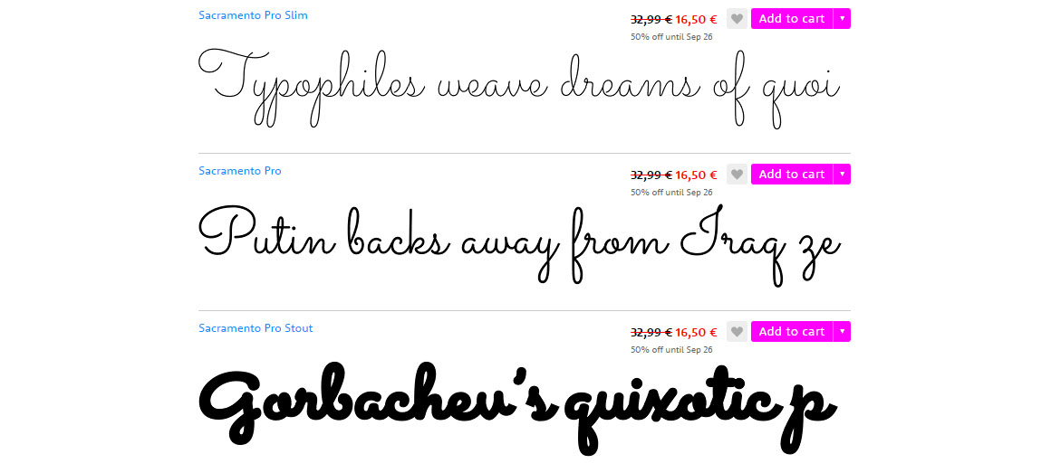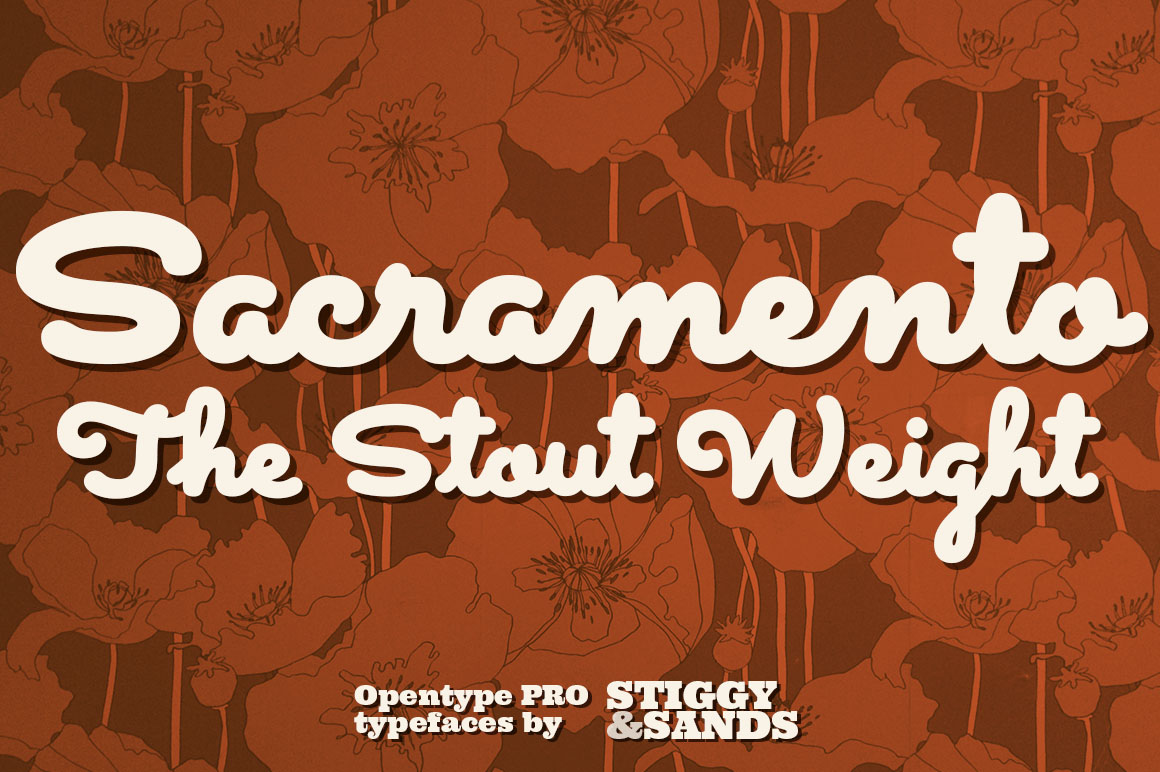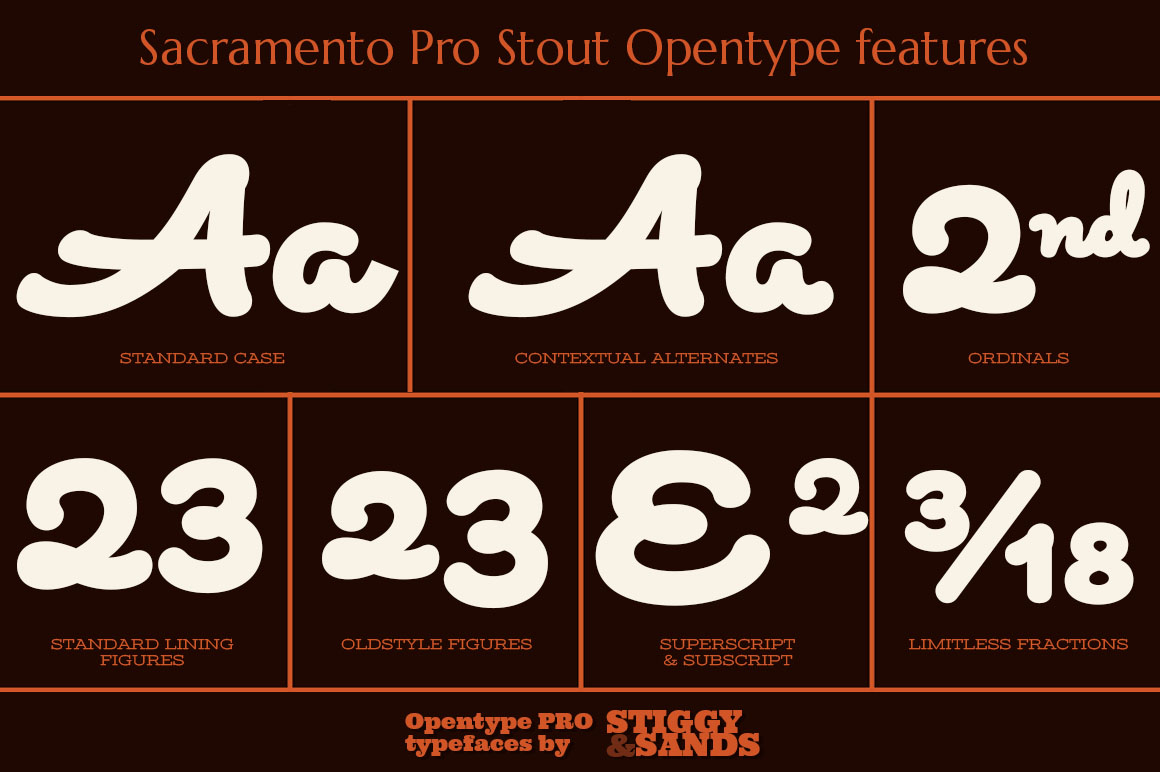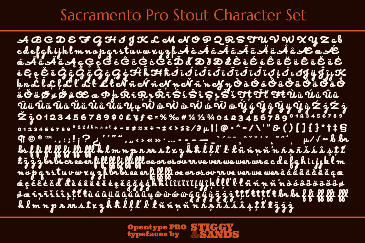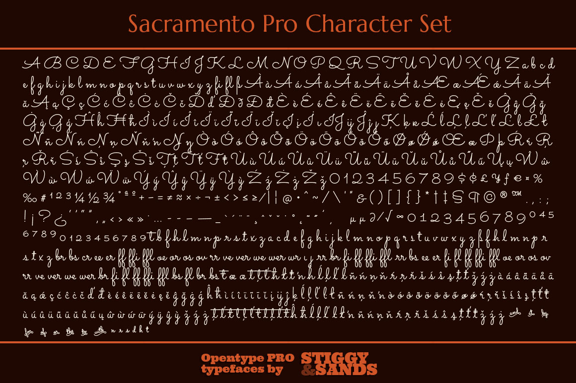 The Sacramento family of typefaces was inspired by a monoline, semi-connected script from hand-lettering artist brochure work of the 1950’s and 1960’s. With its sophisticated upright stance, it stands on a thin line between formal and casual lettering styles, yet it has a commanding presence for headlines and titles. The Slim adds a fine pen-line style, while the Stout style expands the formal/casual dichotomy much further than the original weight. Opentype features include: Contextual Alternates for initial and final forms, Stylistic Alternates for an alternate lowercase t, Discretionary Ligatures* for catch words like “and”, “at”, “by”, “for”, “of”, “or”, “the”, “to”, and “with”, Full set of Inferiors and Superiors for limitless fractions, Proportional and Oldstyle figure sets.
