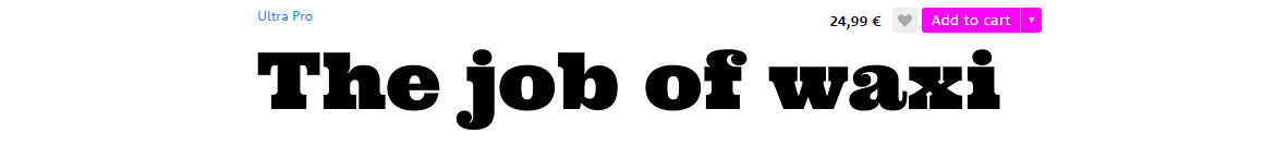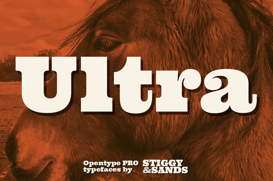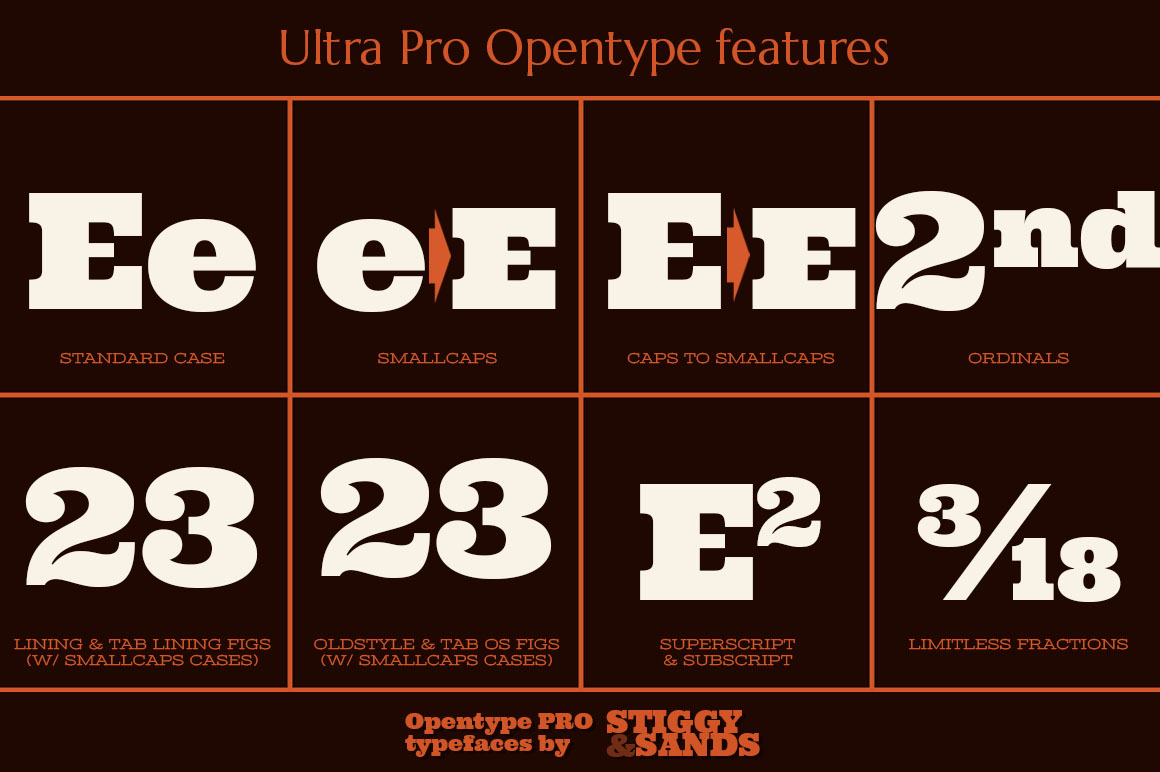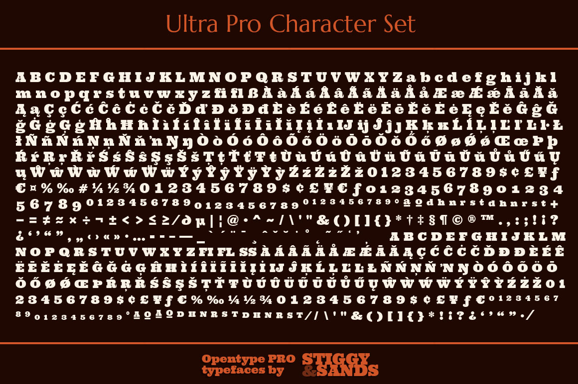 Ultra Pro is an ultra bold slab typeface with nods to wood type styles like Clarendon and Egyptian. Its powerful and dramatic letterforms are both serious in form but friendly in appearance yet it is still easily legible. Perfect for power headlines and titling for impact, the SmallCaps and extensive figure sets only work to further expand the usefulness of the typeface across a wider gamut of design options. Opentype features include: SmallCaps, Full set of Inferiors and Superiors for limitless fractions, Tabular, Proportional, and Oldstyle figure sets (along with SmallCaps versions of the figures), Stylistic Alternates for Caps to SmallCaps conversion.