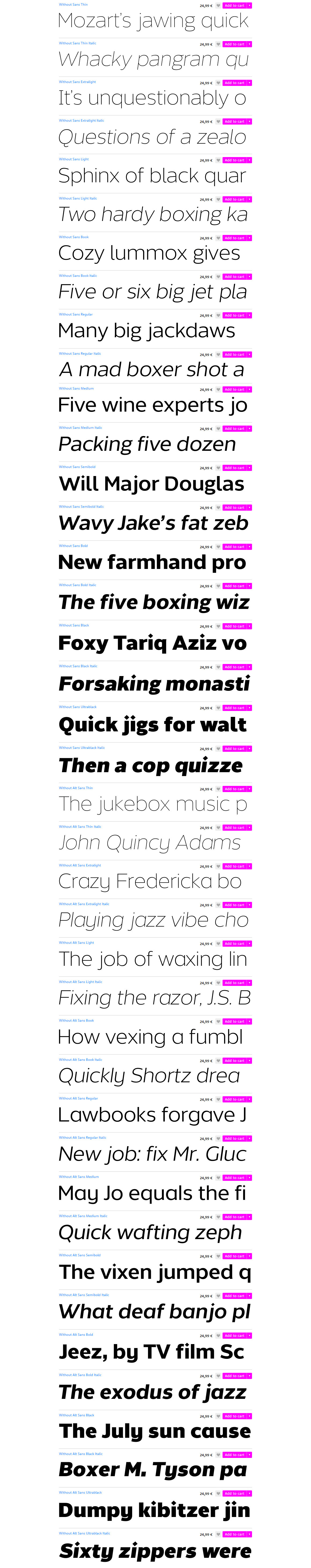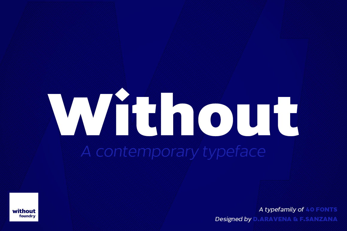 Without Sans is a new geometric sans serif of 10 weights plus matching italics and alt family. It was designed by Felipe Sanzana and Diego Aravena, the founders of “Without Foundry”, in 2014/15. It is inspired by the geometric-style sans serif typefaces that were famous during the 50s. The fonts are based on the geometric forms with a mix of grotesque typefaces. The opentype fonts have an extended character set to support Central and Eastern European as well as Western European languages. It is perfectly suited for highlighting lettering, magazines, web, interaction design, advertising, logotypes, etc.