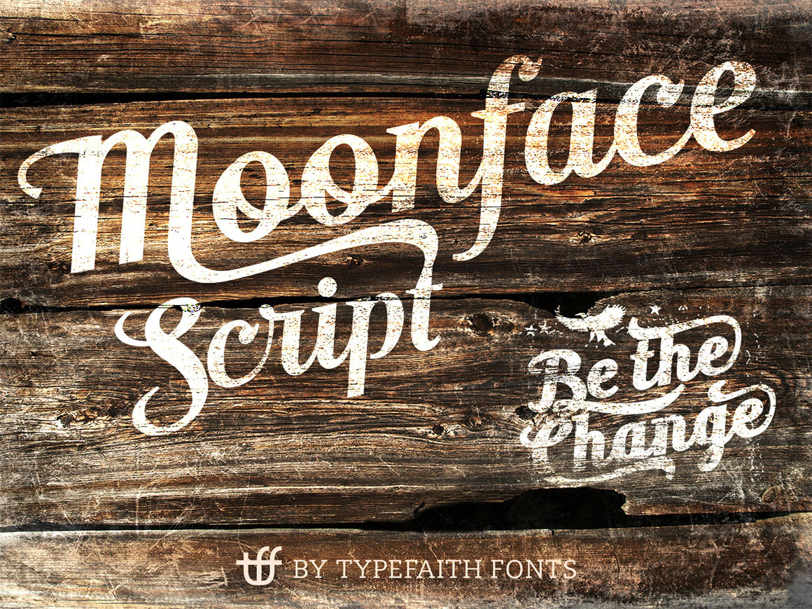 Moonface Script from TypeFaith Fonts is a flowing script with lovely swashes. It is based on the 20th Century Packaging typo. Moonface Script is a characteristic font with a retro feel. It contains a full set of ligatures, alternatives, swashes and special characters to end.