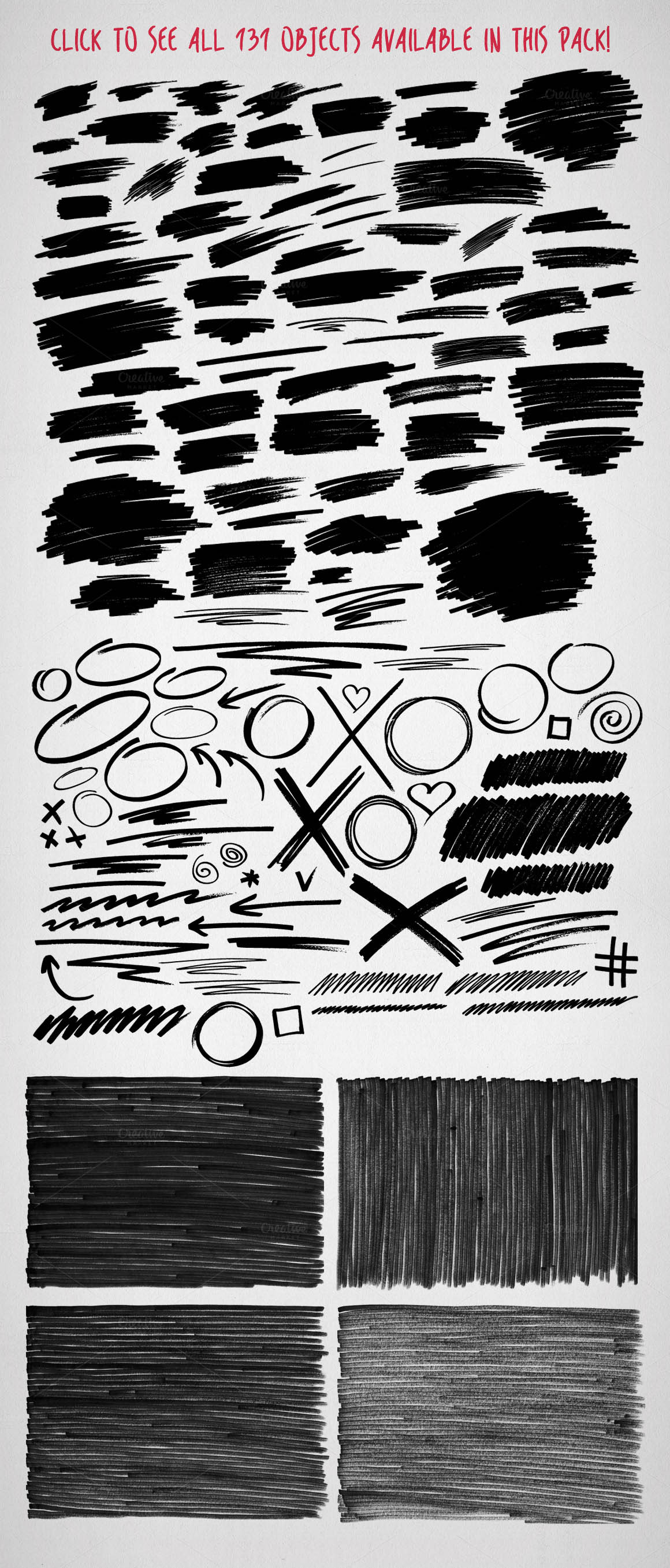 This is a set of 131 elements (including strokes, textures, swooshes, zigzags, circles, cross outs, underlines and more) that can be used in a variety of projects, e.g. flyers, posters, clip art, presentations, backgrounds, websites, you name it.
