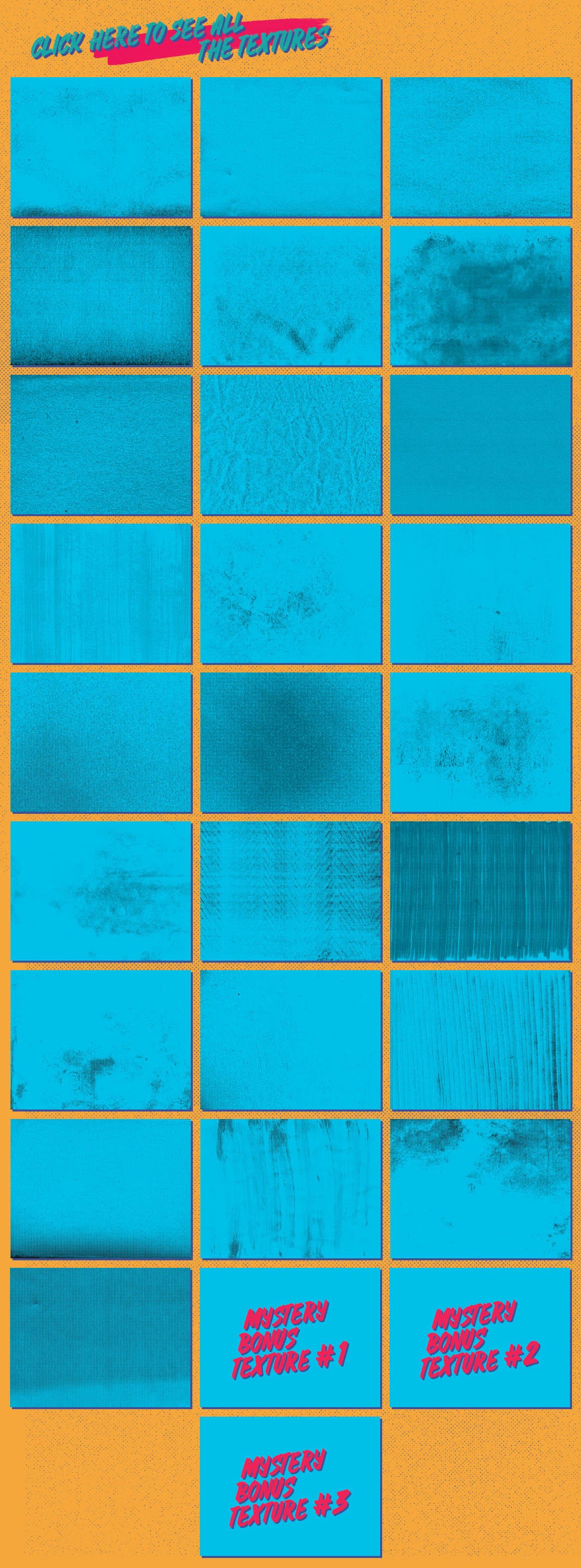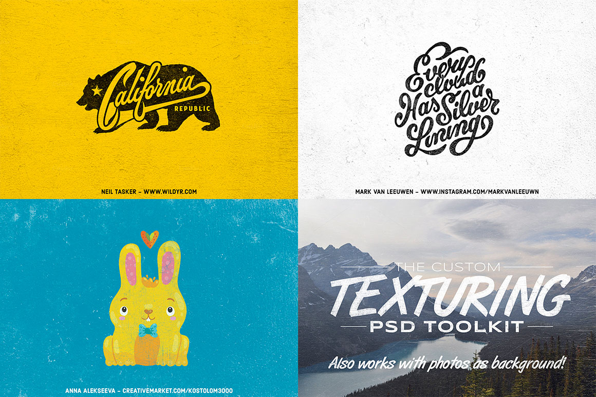 The Custom Texturing PSD Toolkit gives you an easy and entirely customizable way to add texture to your work. With 20 different textures that you can combine, and individually edit (opacity, colors), you can create millions of different combinations that fit best your style. You can easily go from a very distressed feel to a subtly textured look. This is not an action set that applies preset effects automatically. It is a single layered PSD file in which you can select various textures, and customize everything to your liking.