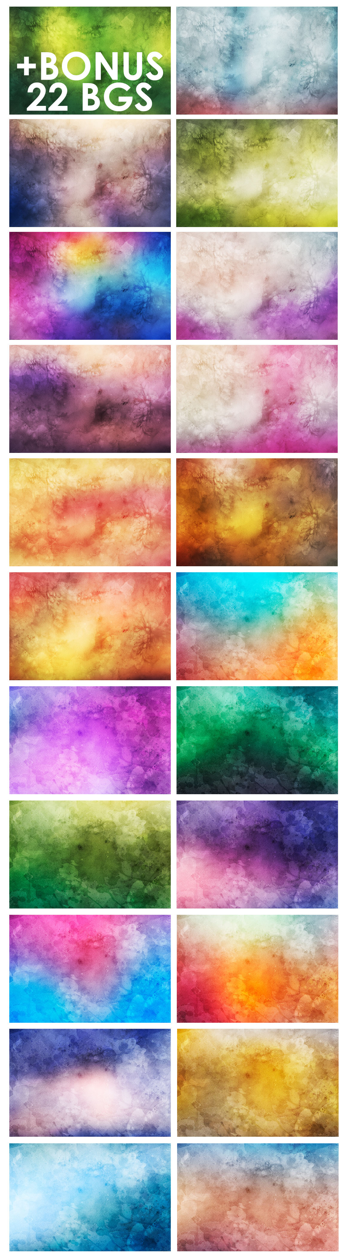 10 Unique hand made watercolor space backgrounds – Very easy to edit PSD files, on&off stars, paper texture, different elements, change colors, etc. Everything are under your control!