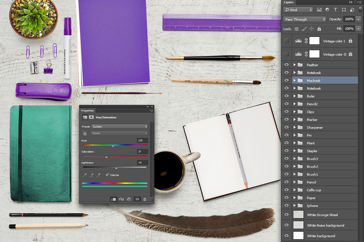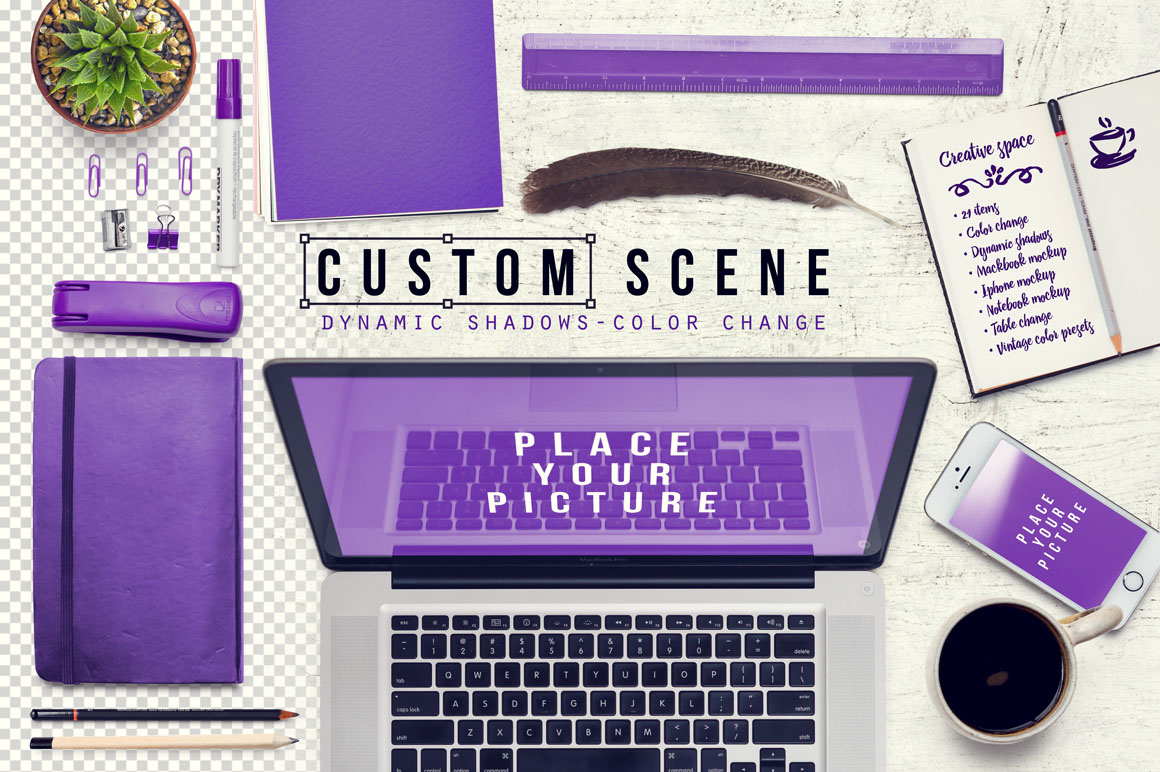 Set to create everyday desktop composition with mockups of notebook MacBook and iPhone 5. You can change the color of objects to your taste in a special layer of color correction. Each object in this scene is split into separated layers. That will give you the freedom to change the size, position, rotation or even hide the object from the scene. Every object in your scene has its own unique shadow which will change its direction depending upon the object’s rotation. You can also easily change up the direction of the light across the entire scene at once.