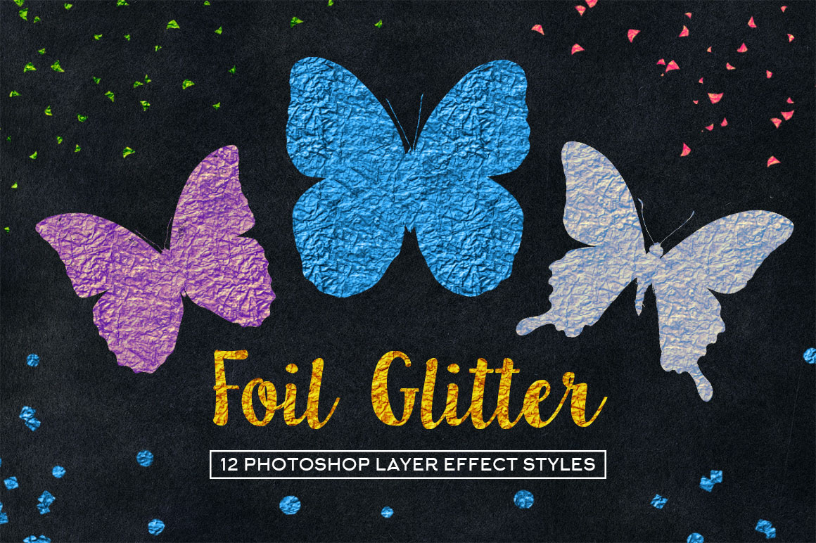 The set of styles for Photoshop layer of 12 seamless colored foil glitter textures.