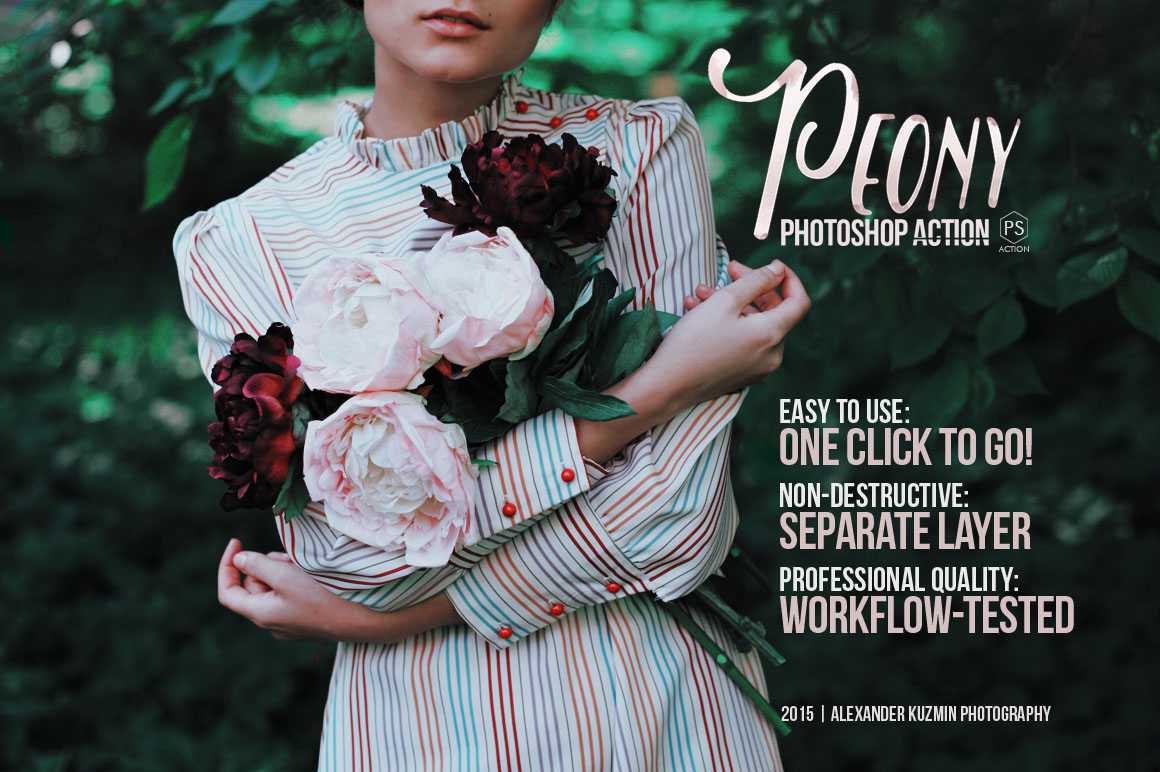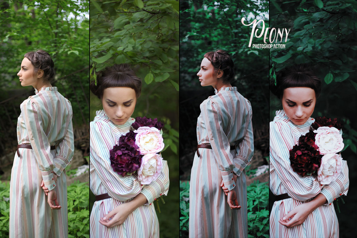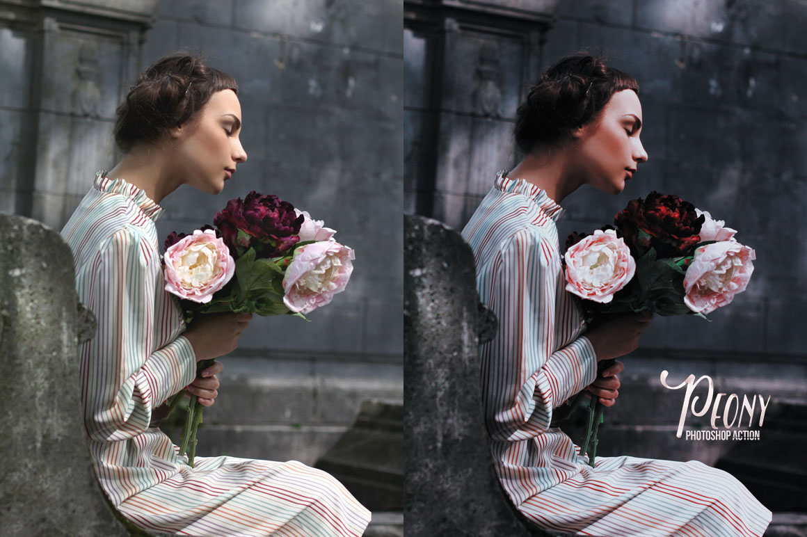 Peony Photoshop Action will provide rich natural toning for portrait, fashion and fineart photography. Tired of dull greens and florals? This action is a perfect solution, adding volume and color depth, with a special color shift tune-up to all the greenery and flowers.