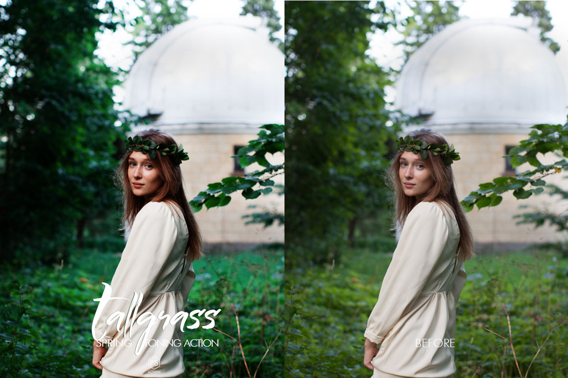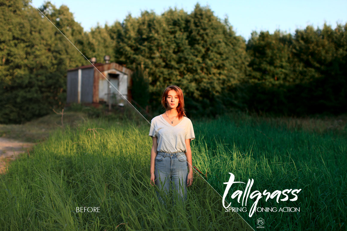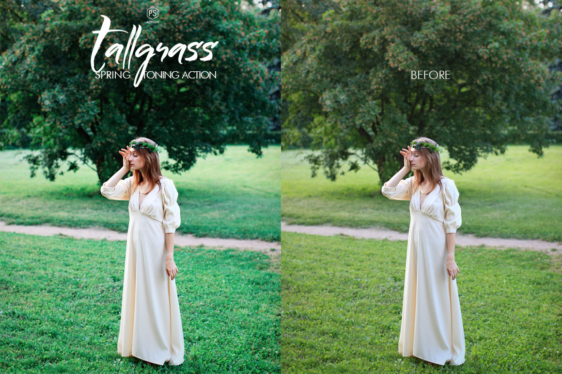 Tallgrass Photoshop Spring Toning Action will provide natural toning for portrait, fashion, wedding and landscape photography. Tired of dull greens on your summer and spring images? This action is a perfect solution, adding volume and color depth, with a special color shift tune-up to all the greenery.