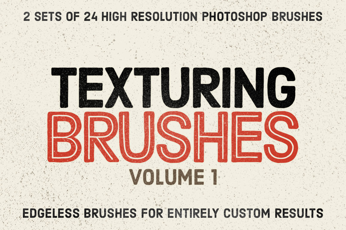 Texturing Brushes Volume 1 is a composed of two sets of 24 Brushes each for Photoshop. Very easily and quickly apply subtle, grungy and/or distressed textures to your images. Use multiple brushes, and in different sizes to create unique texture combinations on your work! The Brushes are edgeless and by default rotate on every click, so you can cover a whole surface with the same brush without feeling the repetition of the texture! The Brushes are of various sizes, between around 1800 and around 2000 pixels each.