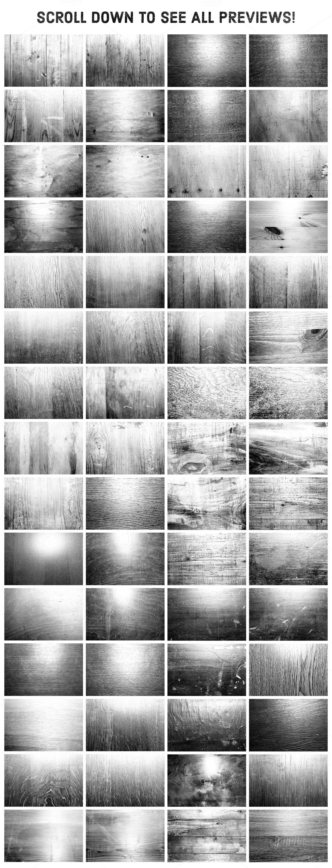 The set is composed of 60 high resolution photographed wood textures! Each texture is available both in: Transparent PNG to easily overlay the textures over an image and Flat black and white JPEG files, to easily paste the textures in a mask. For both file formats, the files are 4500 x 3000 pixels at 300 dpi.