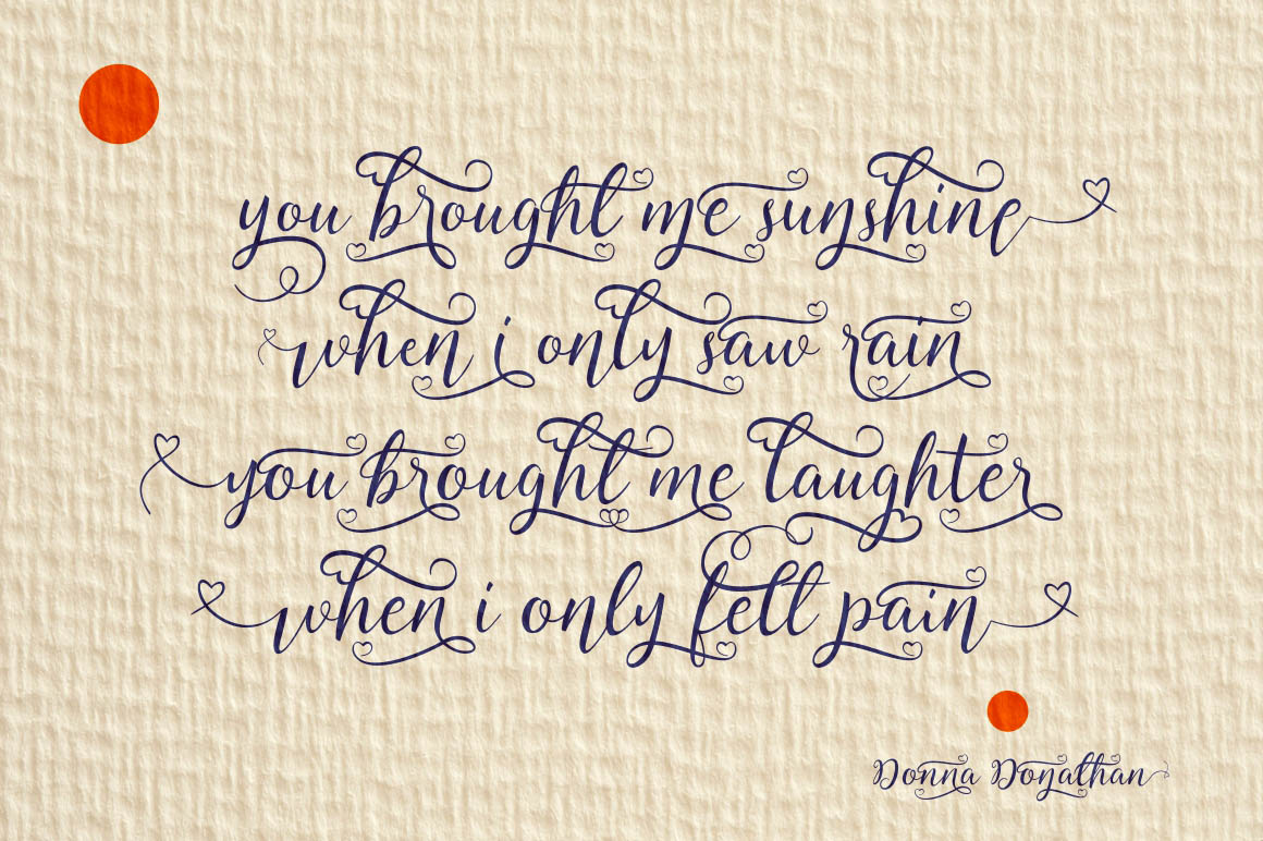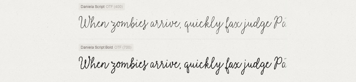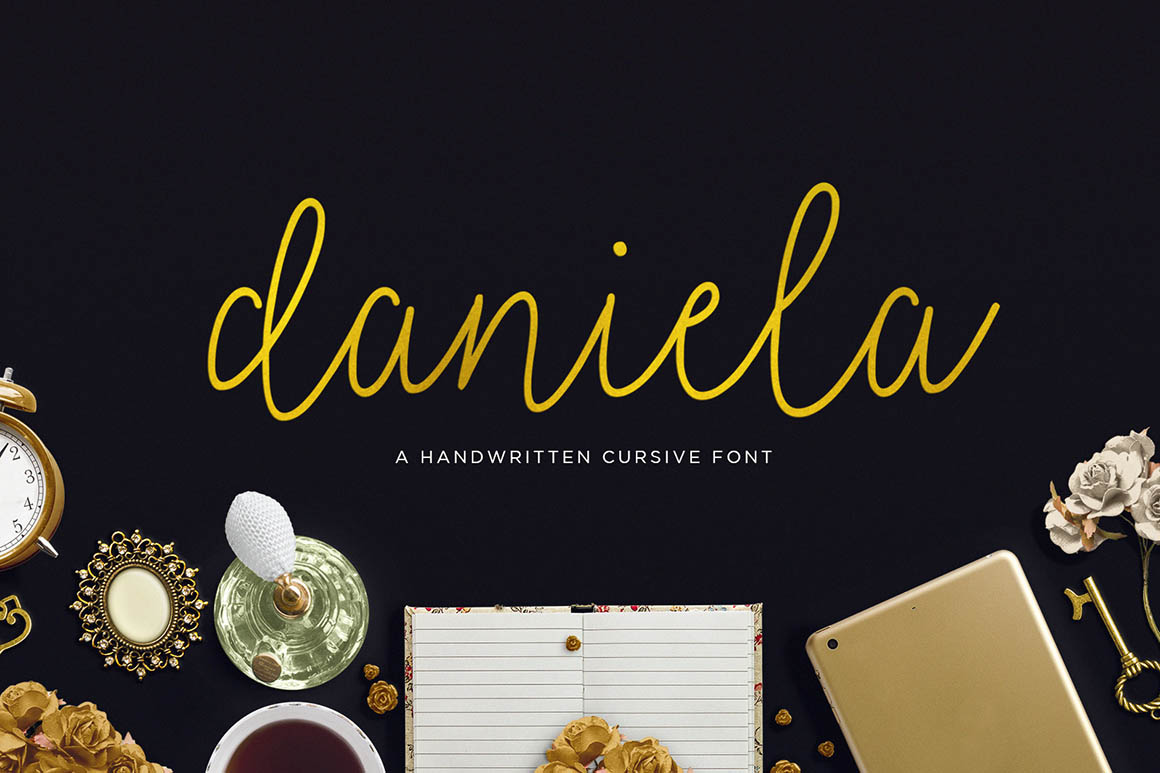 Daniela Script is a handwritten cursive font, modern and elegant script. Can be used for various purposes such as logos, wedding design projects, invitations, heading, t-shirt, letterhead, signatures, greeting card, handwriting and more. Daniela features 370+ glyphs and 184 alternate characters. including initial and terminal letters, alternates, ligatures and multiple language support.