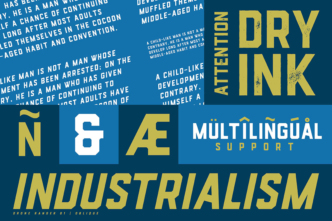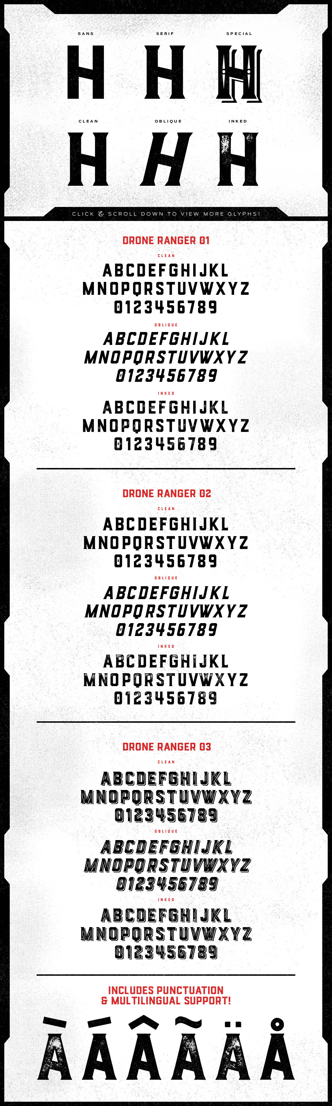 Drone Ranger is a geometric display family that includes 9 various styles for your designing needs. Included in the family is a Sans version, a Serif version, and a Special Decorative version, and each of these have their own clean, oblique, and inked styles. Drone Ranger lends itself perfectly to sports design, logos, posters, packaging, brochures, t-shirts, and so much more!