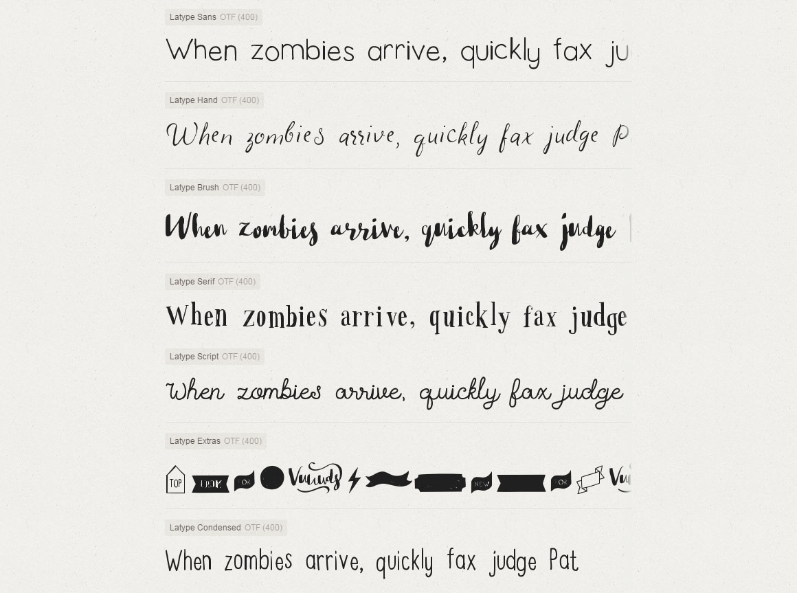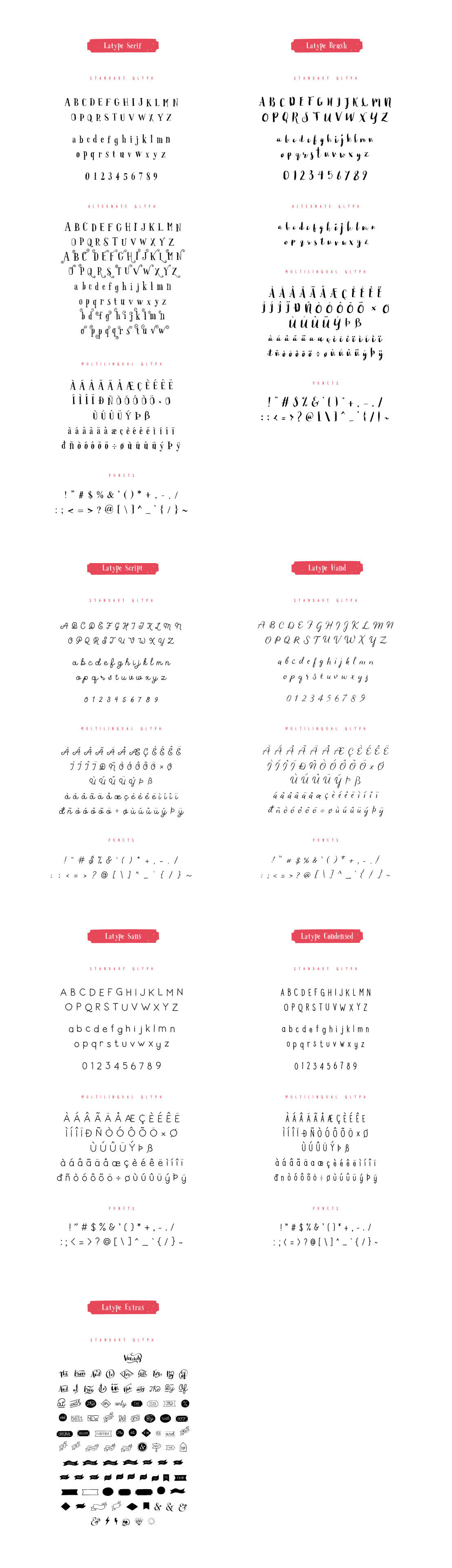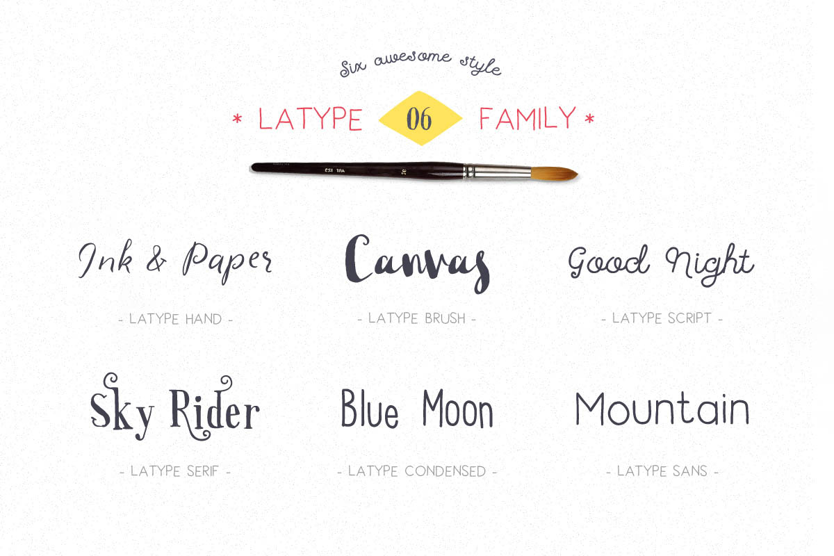 Introducing Latype font family! come with 6 different style and 1 awesome extras. Every single letters have been carefully crafted to make your text looks awesome. With lot of alternate glyph will make your word feel like natural hand drawn. This font can be used for quotes, poster, wedding, branding, logo, fashion, apparel, letter, invitation, stationery, etc.