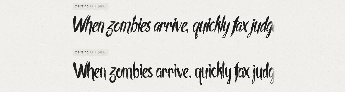 The faino is a font that uses a brush handwriting font style. Character is very unique, have texture and fun, suitable for a wedding invitation, badges, foods menu design etc. Small font size (ex : 38pt letter) still look very good and readable. Bigger size of this font will show great detail of this brush character.