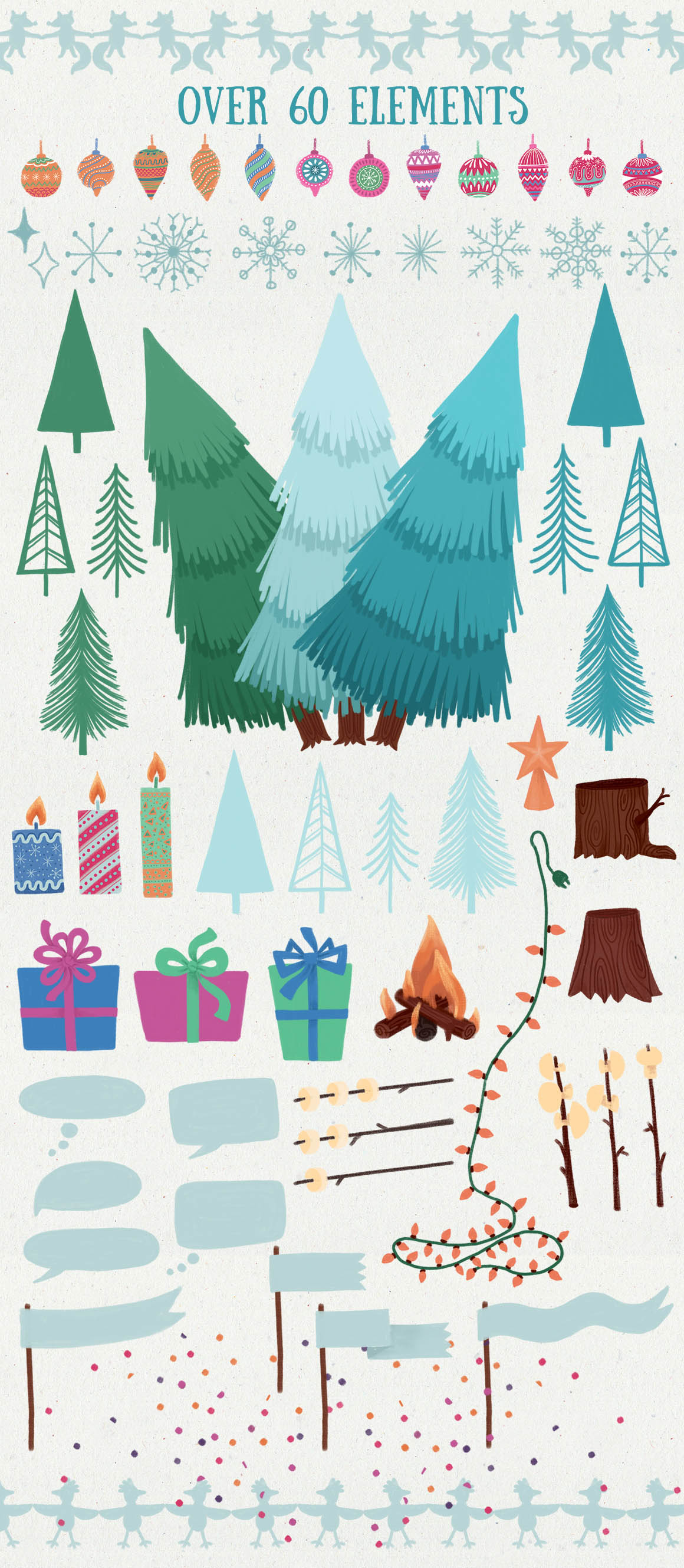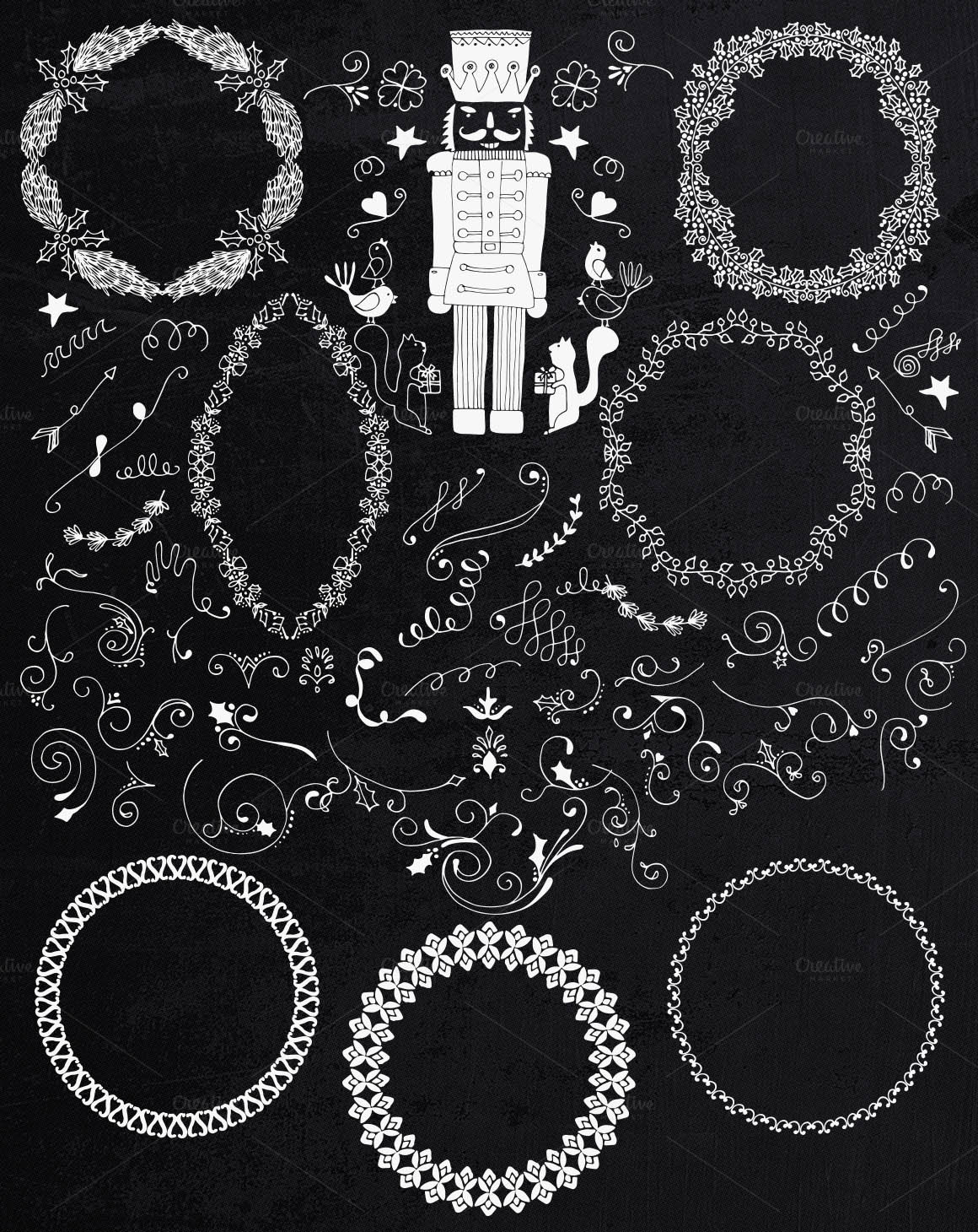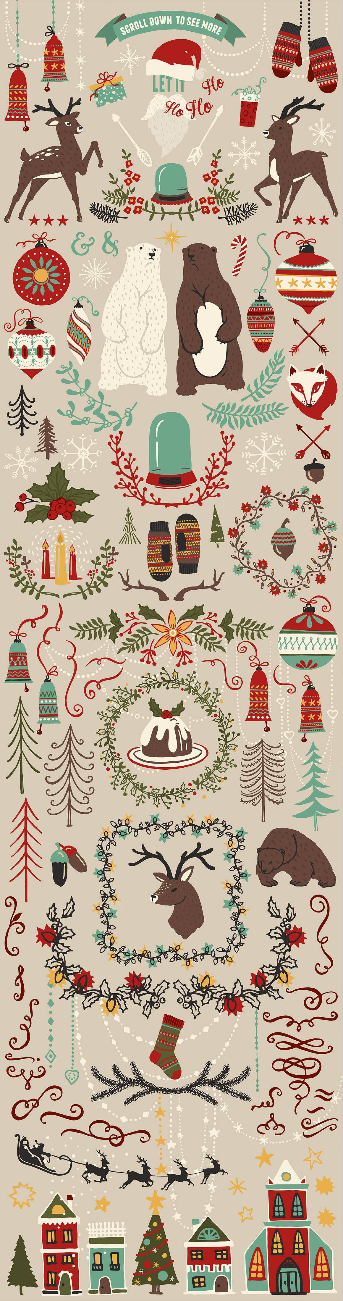 A HUGE Hand drawn Designer’s Element Kit for Christmas – includes 100’s of beautiful hand drawn elements, including presents, birds, wreaths, snowmen, arrows, swirls, laurels, frames, candy canes, squirrels, snow globes, a bear, borders, leaves, flowers, decorations, strings, bows, toys, deer and banners/ribbons. Also includes Illustrator brushes to create an endless array of beautiful designs.