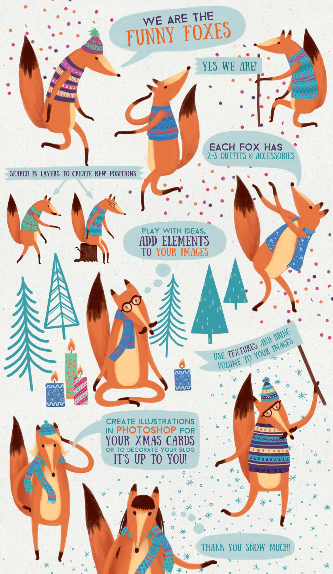 Looking forward to Xmas fun? I know for sure these funny foxes are. Christmas Illustration Creator/Foxes is a pack of 5 funny foxes and over 60 winter & X-mas elements. There are tons of possibilities. Each fox has at least 3 different positions for hands and legs and 2/3 accessories and sweaters. You can easily mix them up and create entirely new positions and variations. The Creator pack works only in Photoshop. All the elements are made in CMYK color model, at a 300 DPI and a resolution of approximately 4000x2900px.