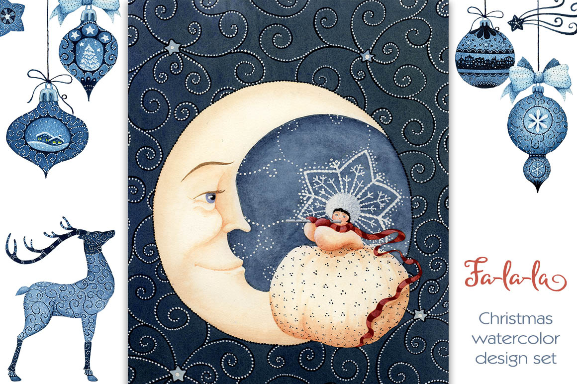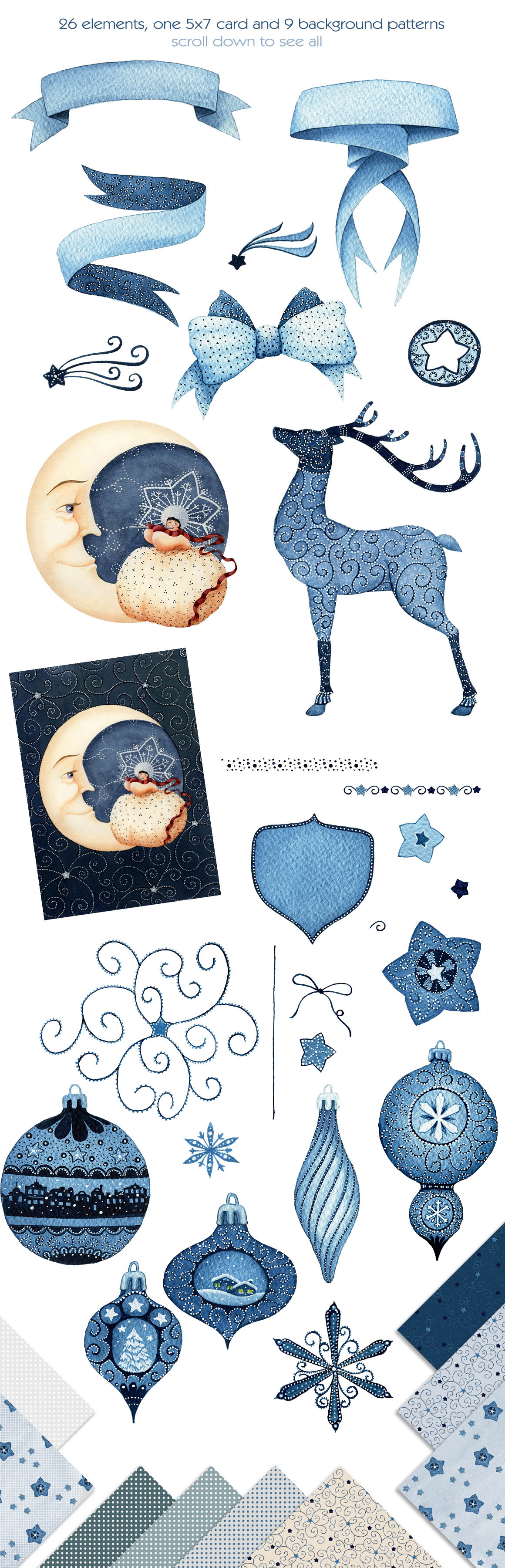 Fa-la-la your Christmas in indigo – hand painted watercolor set of 26 elements + 1 card + 9 background designs. High quality 300 dpi images. All elements are transparent background PNG. Card and background designs are highest quality JPG.
