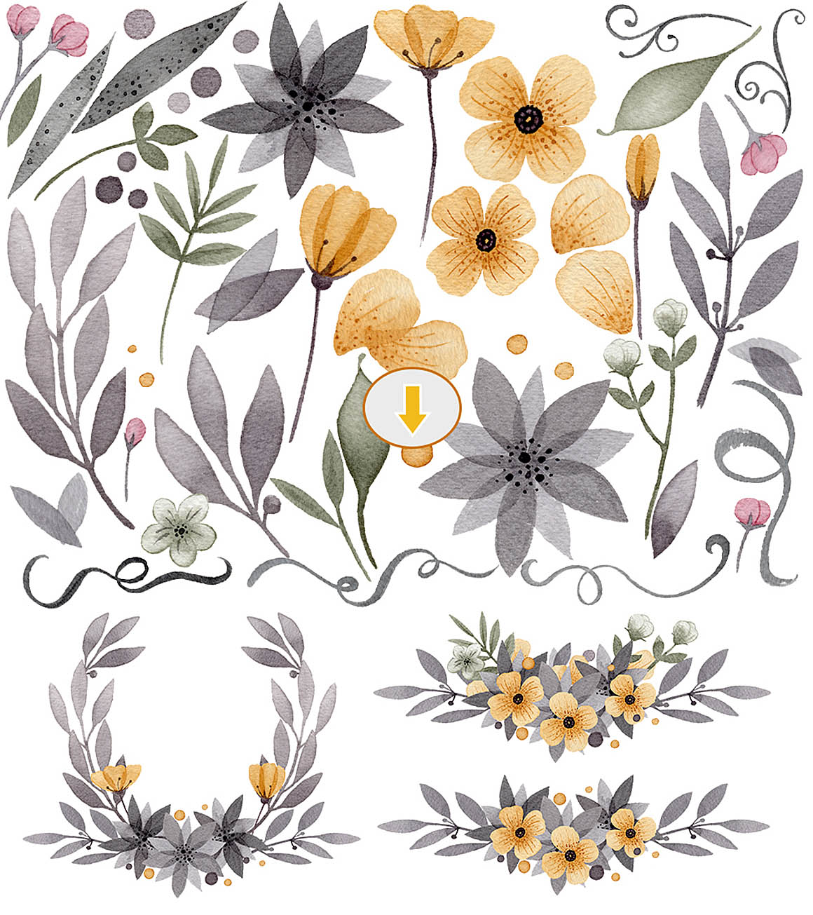 Romantic floral collection to add to your graphics stash Perfect for wedding and party invitations, greeting cards, calendars etc. This set includes: 49 PNG single elements – flowers, branches, buds, leaves, dots 4, 1 PNG monogram laurel, 2 PNG posies. All files are 300 dpi transparent background PNG Size of elements from 100px to 4230px.