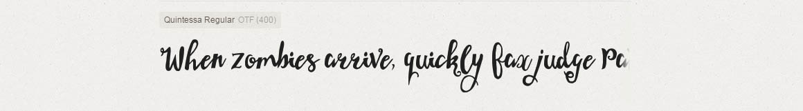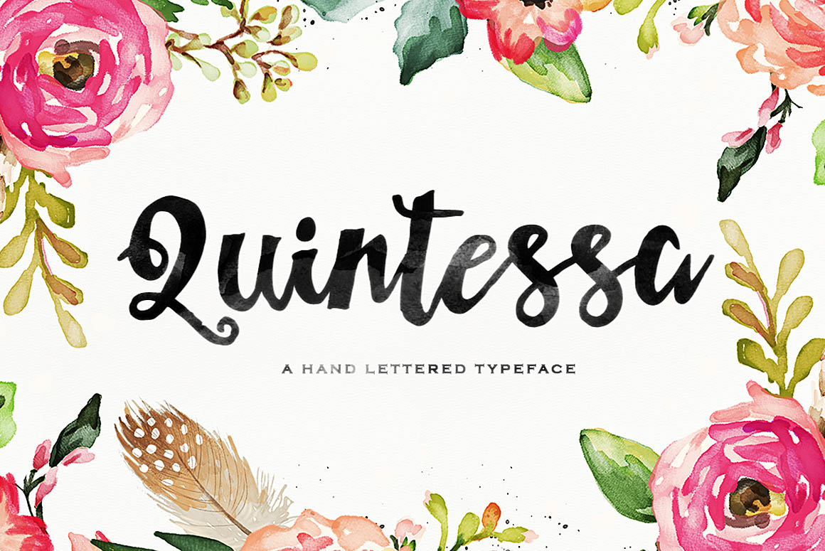 Quintessa is a hand lettered and modern calligraphic font perfect for wedding design projects, invitations, greeting cards, signatures, watermarks, logos, and more. Features: Uppercase -Lowercase -Numerals -Basic punctuations Available in .OTF and .TTF formats.