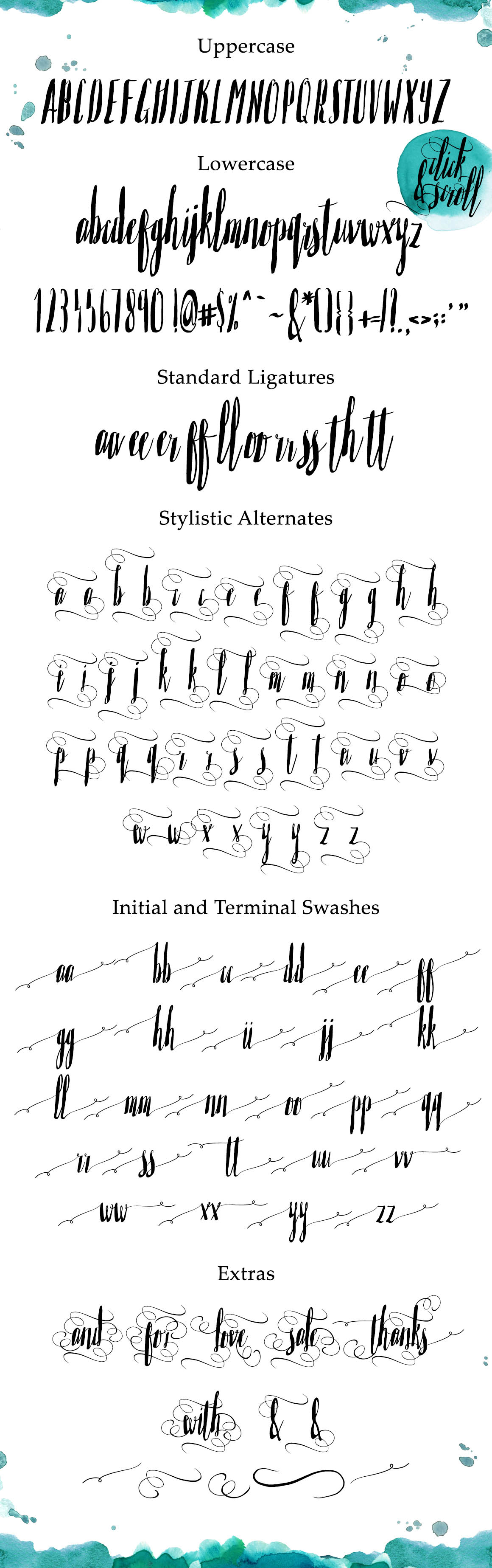 A gorgeous hand drawn brush script with tight kerning and swashes galore!! Included is the Standard, Alternates, Swashes, and extras. Please click and scroll image 2 to see all that is included. Please install all 4 font files to use all features. The initial swashes are accessed using Uppercase (shift) and the Upper Alternate swashes are accessed using Uppercase (shift).