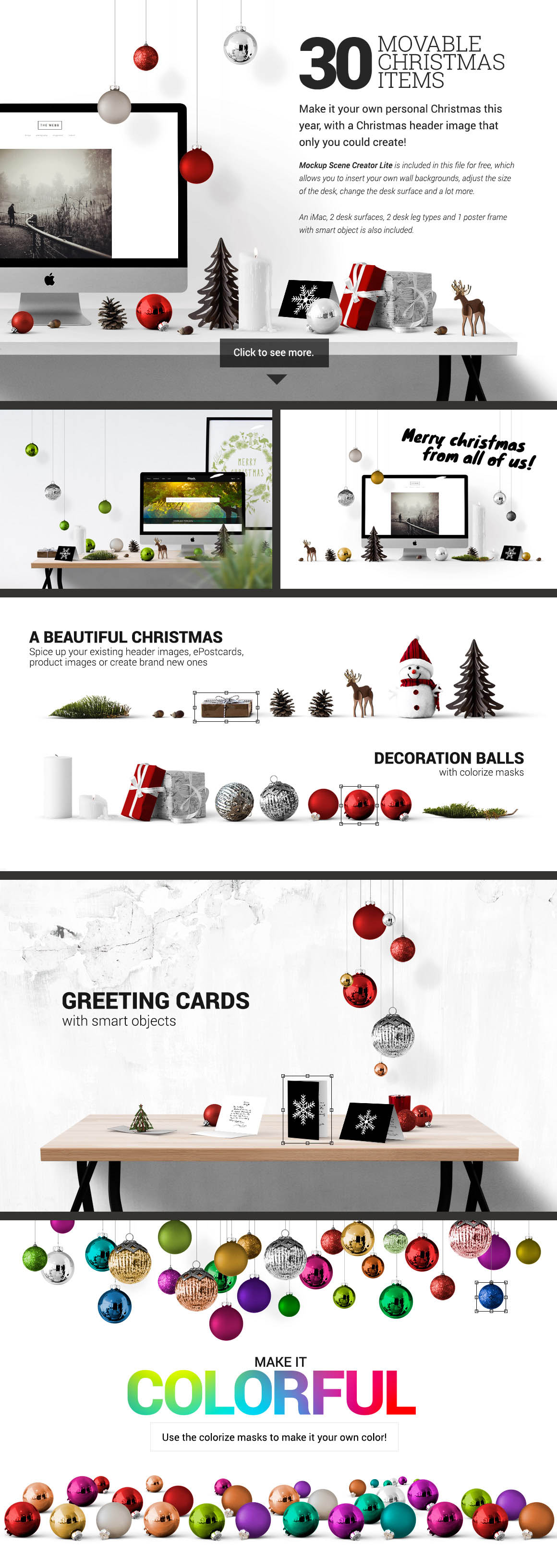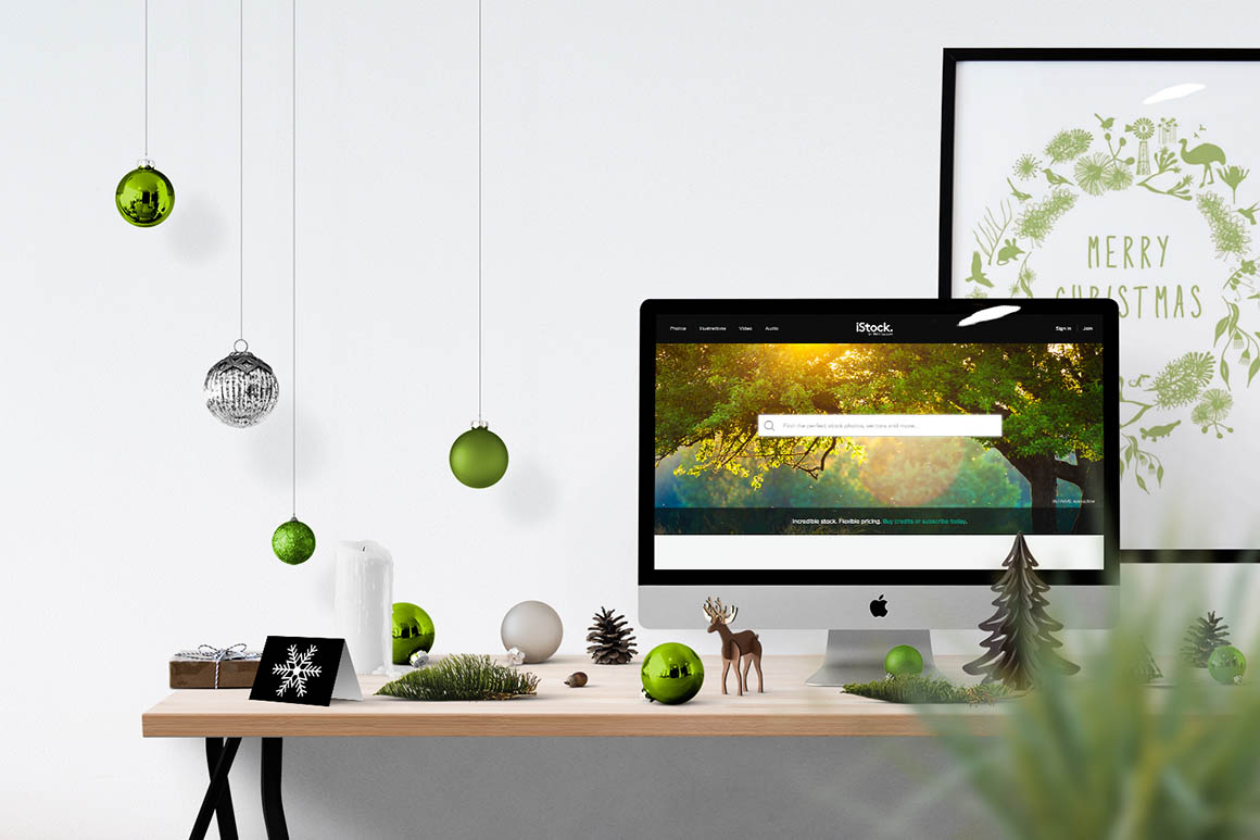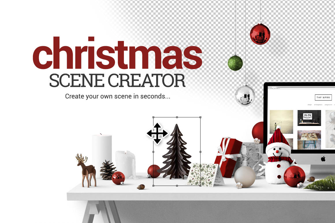 Create your own Christmas scene! – in seconds. Use it for header images, product mockups, environment designs, ePostcards, etc. A great way for any creative person to add a full touch of christmas to their work presentations. In this psd file you can create your own fully customizable Christmas desk environment where you can display your own work, your clients work or maybe your Christmas greetings. Add your website design into the iMac screen, and add your greetings to have the perfect company ePostcard of the year. In this Christmas Scene Creator, you get full control of the desk, and all the Christmas decor that you would find in the Mockup Scene Creator.