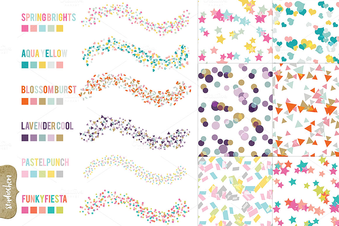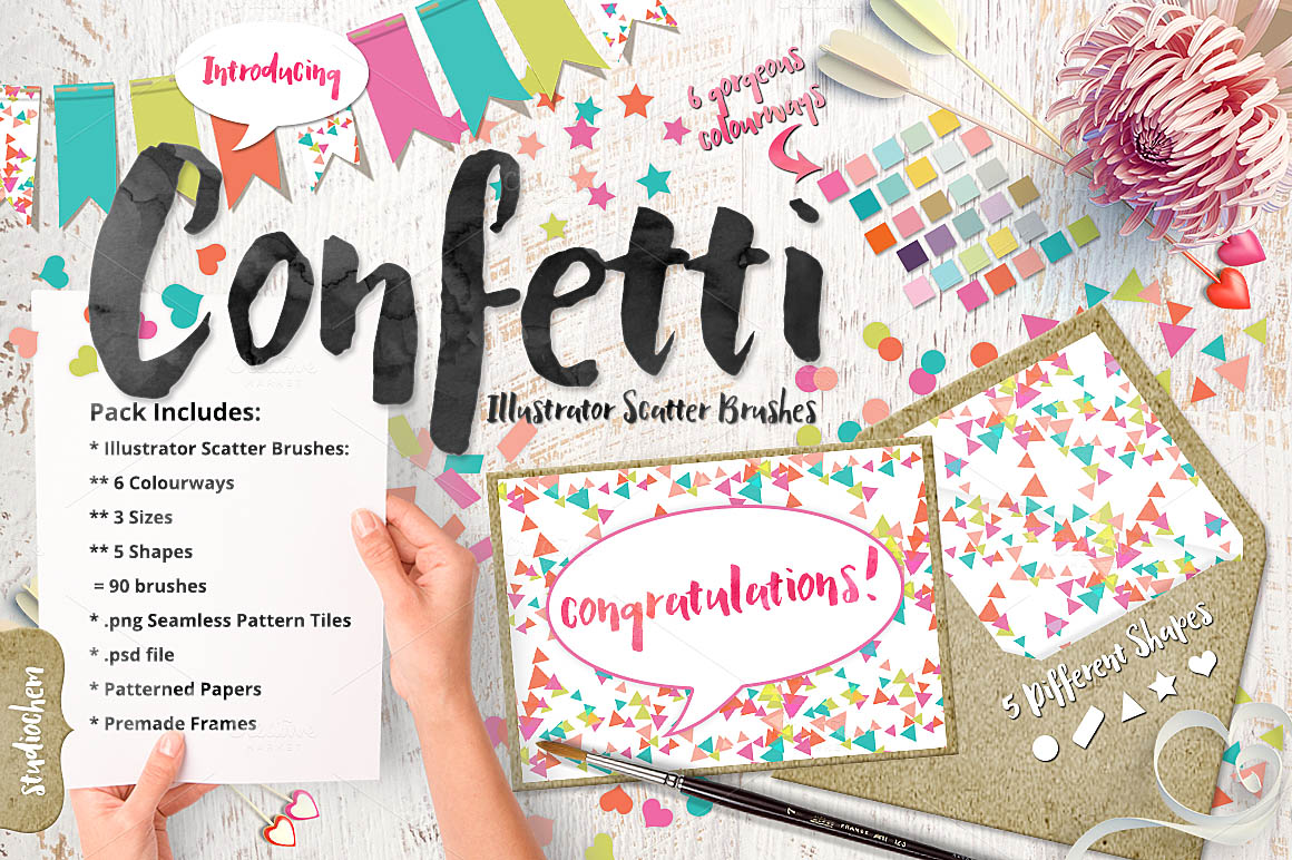 It’s party time! And you need to jazz up your designs with some colourful and fun confetti. Included in this pack is everything you need to add confetti in 6 gorgeous colourways and 5 different shapes to your next design project, be it invitations, logos, websites or party printables. What you get: Illustrator Scatter Brushes in 6 colourways, 3 sizes and 5 shapes totalling a whopping 90 brushes, .png Seamless Pattern Tiles, A .psd file with the confetti in each configuration, Premade Frames in all the shapes and colourways ~ A total of 30 Frames, Patterned Papers (3600px x 3600px).