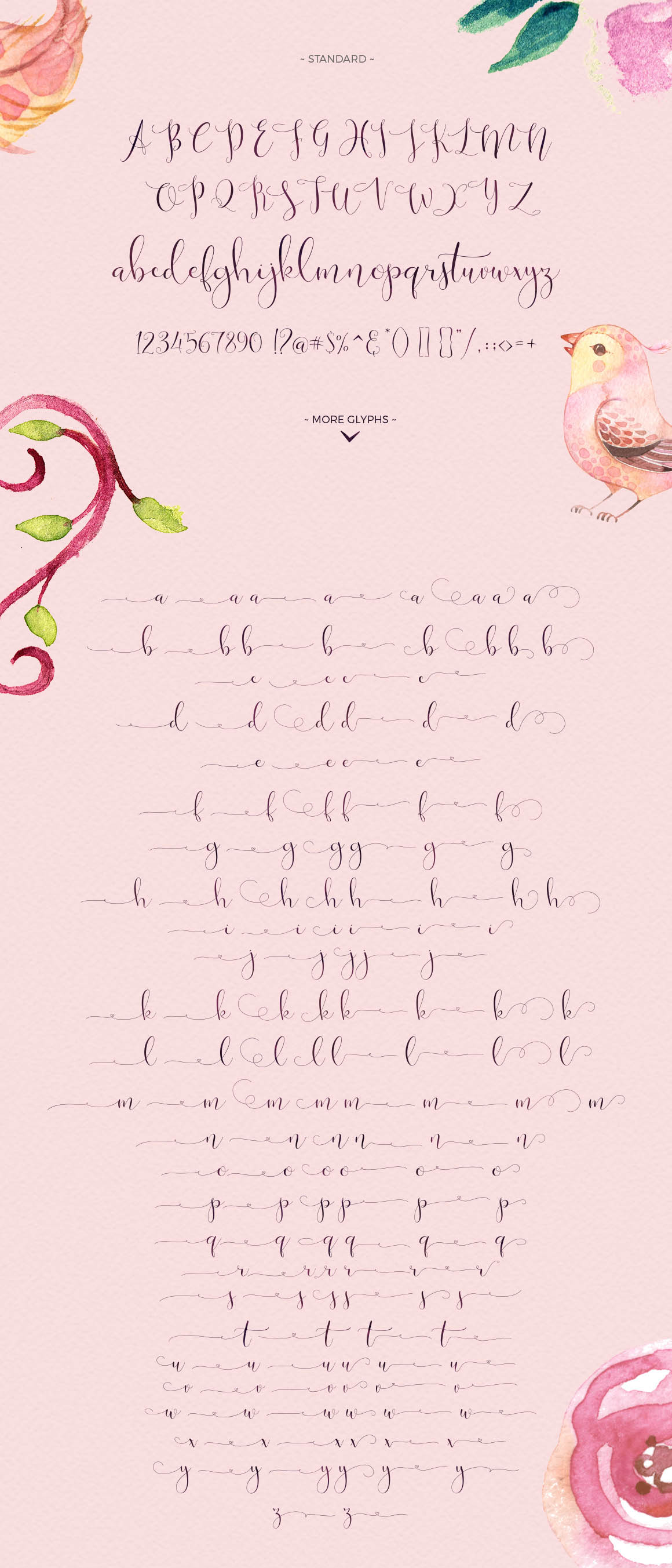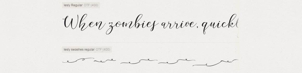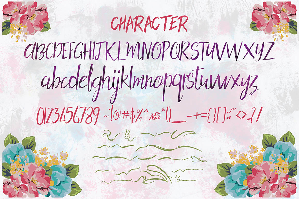 Lesly is handmade script font cooked with feeling. Including a tons of glyphs, alternates, ligatures. Can be used for various purposes; headings, signature, logos, wedding invitation, t-shirt, signage, lable, posters, badges etc. To enable the OpenType alternates, you need a program that supports OpenType features such as Adobe Illustrator CS, Adobe Indesign, Microsoft Word 2010 or later versions. There are additional ways to access alternates/glyphs, using Character Map (Windows), Nexus Font (Windows) or a software program such as PopChar (for Windows and Mac).