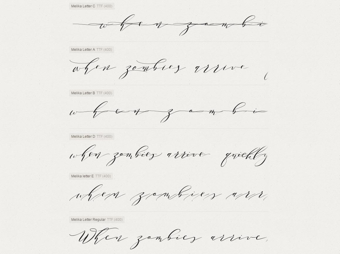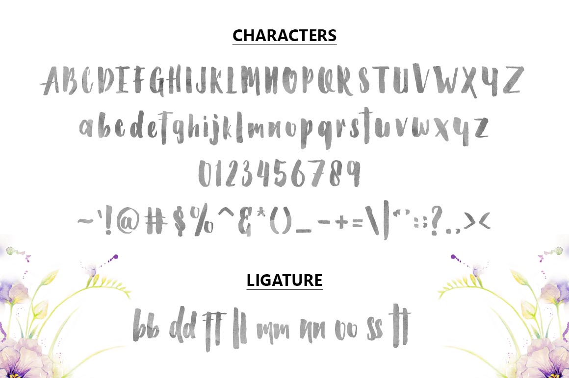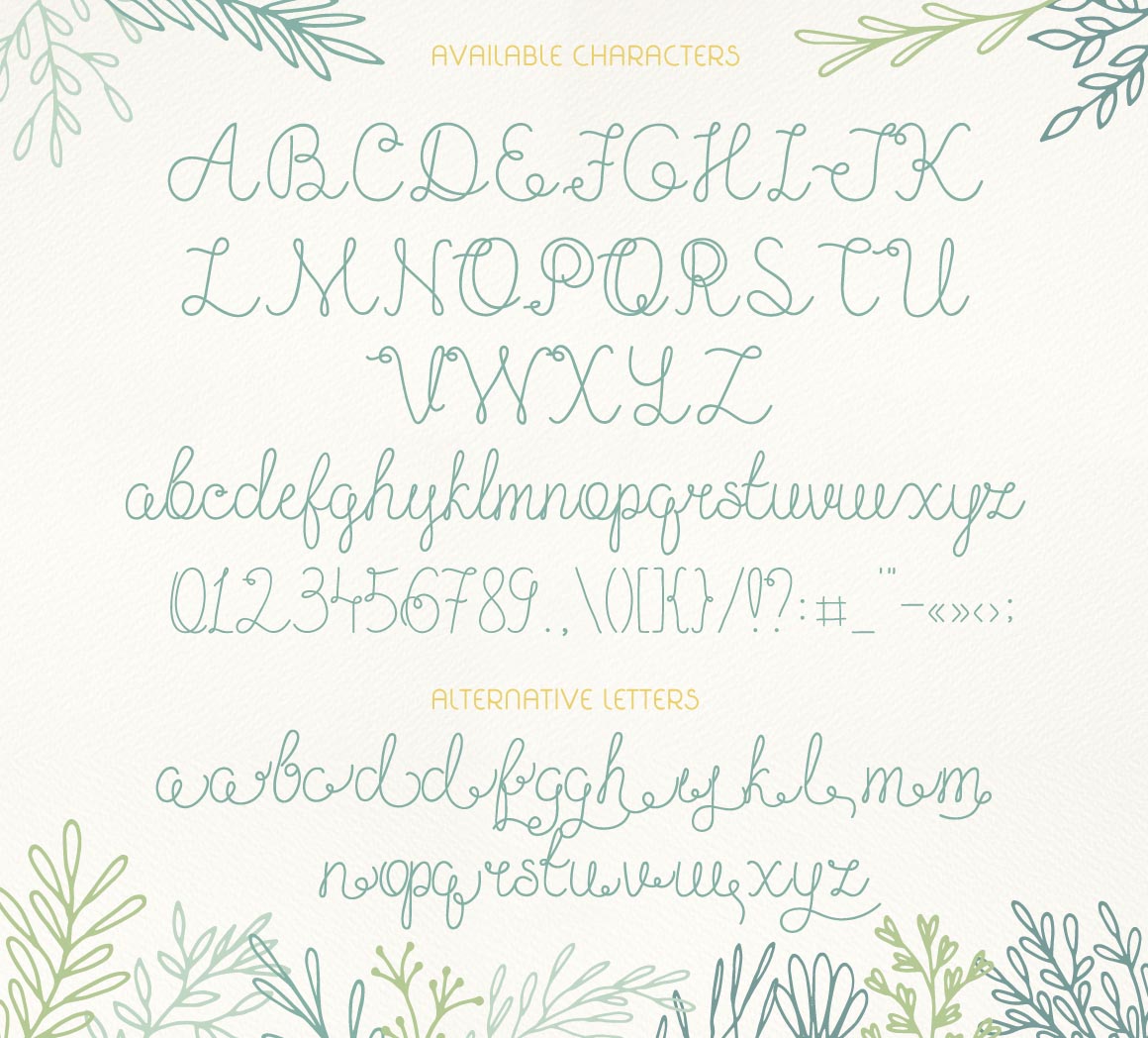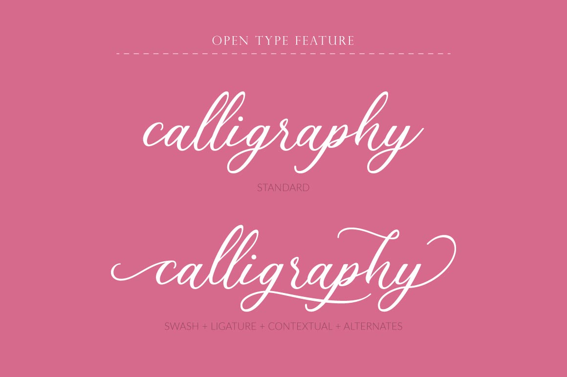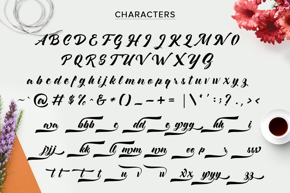 Hand Lettered Calligraphy Font with beautiful wave and natural flow. This fonts is the sister of Melika Script. have unique letter, with natural handdrawn style, and has a softer and smoother character with finely connected all of characters. They have beautiful simple elegant swashes in separated font, You can use any graphic design software to access the alternative letters. Melika Letter is suitable for weddings, invitations, greeting cards, quotes, posters, branding, name card, stationary, design title, blog header, art quote, typography art, modern envelope lettering or book design, happening style like handdrawn design or watercolor design theme, craft design, any DIY project, book title, wedding font, pop vintage design, or any purpose to make our art/design project look pretty and trendy. Melika Letter come complete with 361 glyphs. This includes uppercase, lowercase, numerals, fractions, punctuations, multi lingual support. and most other glyphs is a variation which is parts of the OpenType features such as; Standard Ligatures, Contextual Alternates, Stylistic alternates.