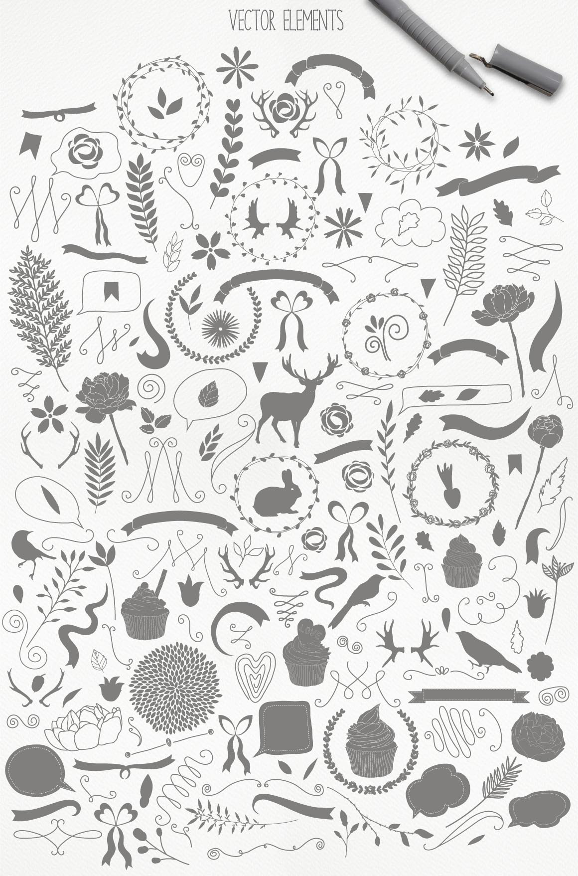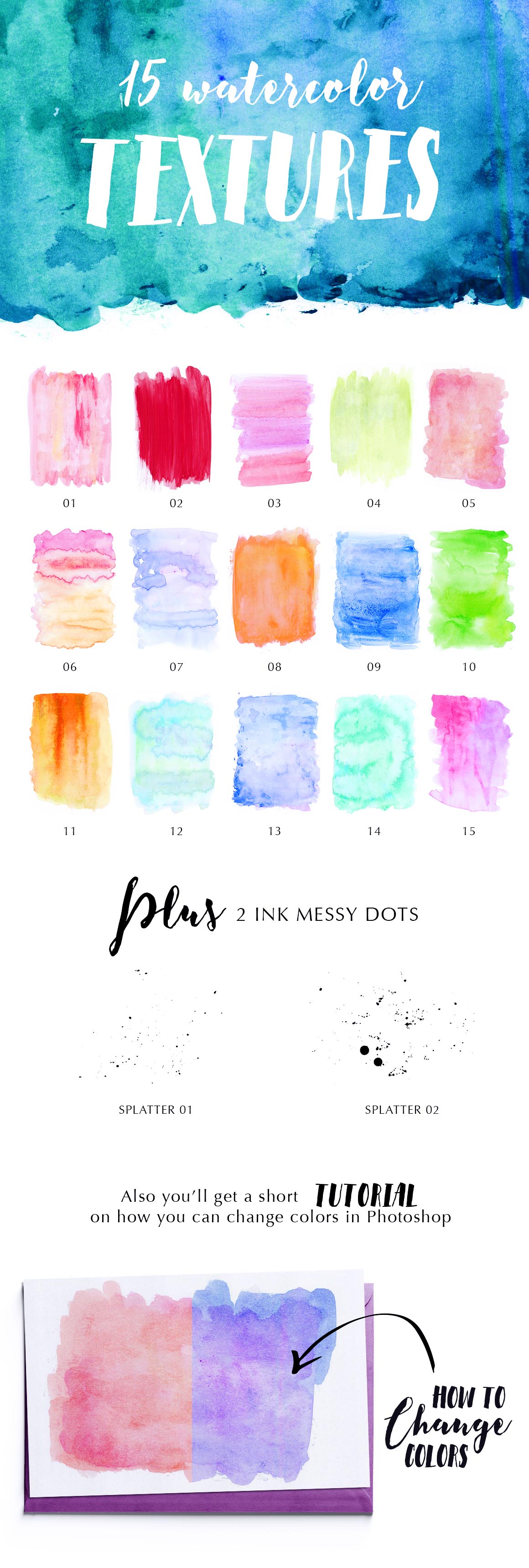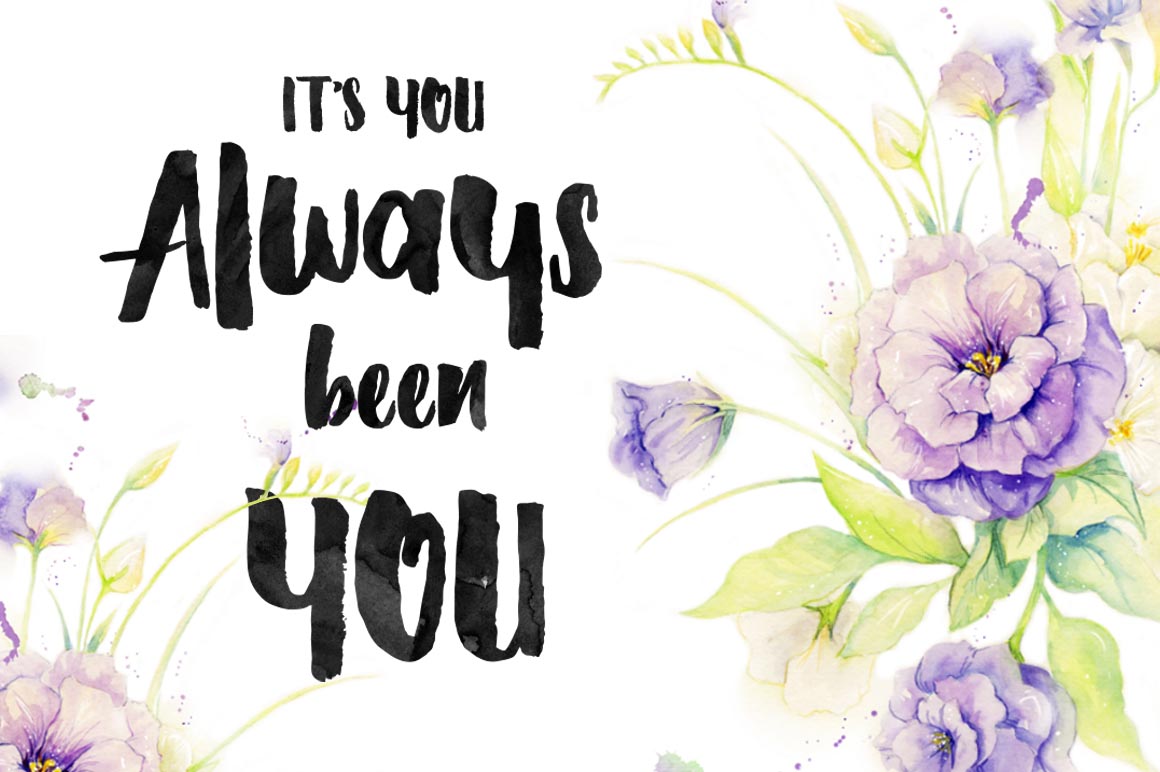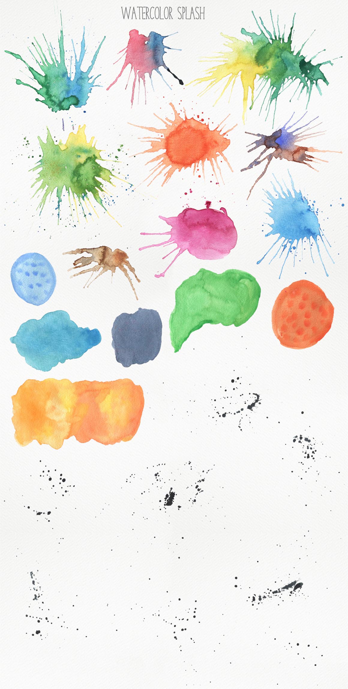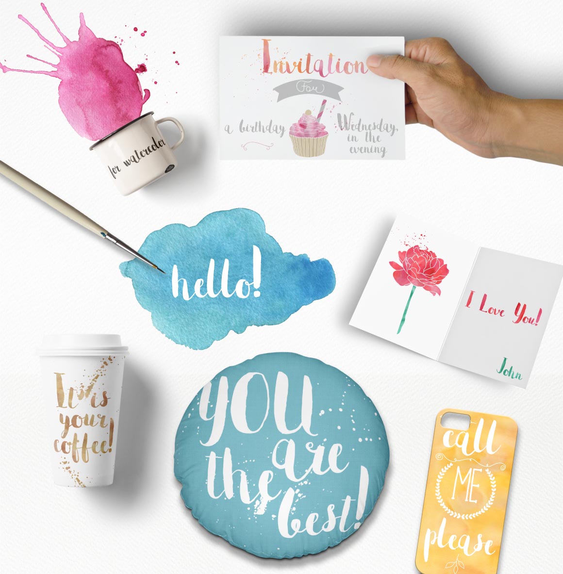 It’s watercolor font drawn by hand! Also in this package, I added a lot of free bonuses. It’s: 23 watercolor splashes; 44 watercolor textures; 200 vector elements; 16 catchwords.