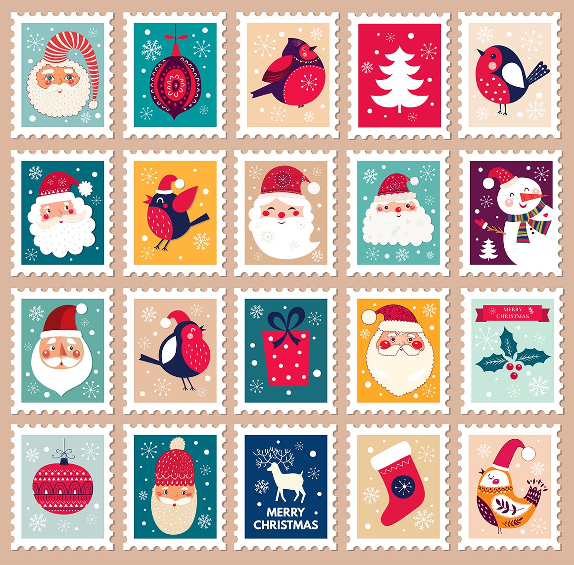 Beautiful Christmas collection of decorative traditional elements and symbols of Christmas. Ideal for print and decoration your holiday projects, tags, greeting cards and other prints. Beautiful collection of postage stamps with Christmas decorative elements. Cheerful vector illustration with snowman. Vector EPS files!