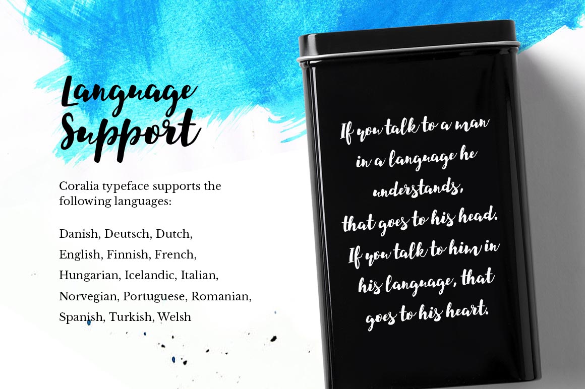 Coralia is a brush typeface that comes in 2 weights, each being made from 200+ glyphs perfectly combined. Coralia typeface supports the following languages: Danish, Deutsch, Dutch, English, Finnish, French, Hungarian, Icelandic, Italian, Norwegian, Portuguese, Romanian, Spanish, Turkish, Welsh. Coralia typeface will add a unique note to your design, branding or printing projects.