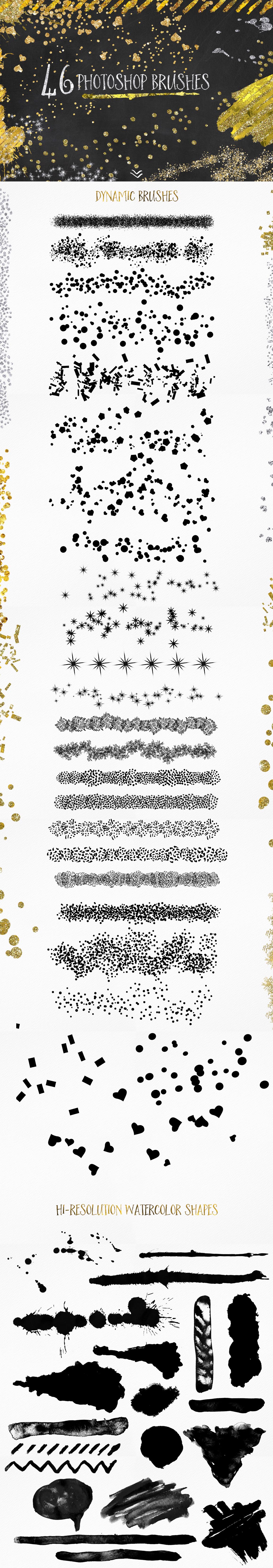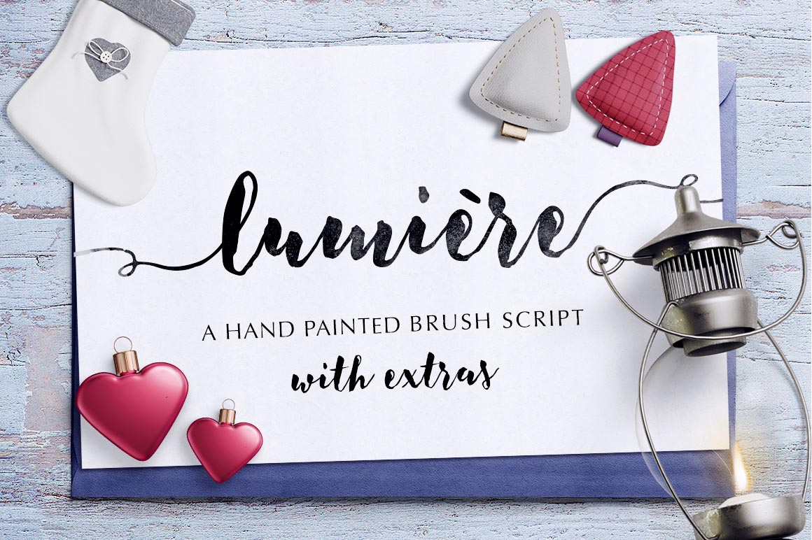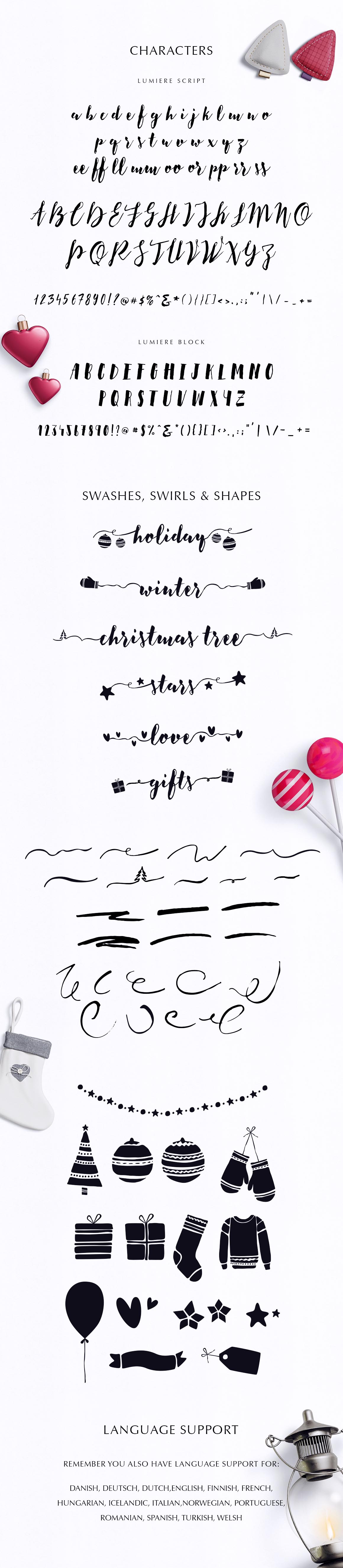 Lumiere is a hand painted font that comes with 2 different styles perfect for your invitations, labels, newsletters, web, headings, stationary or any other projects. Lumiere Script is very much a hand made script with a nice flow and a rough edges, given by the brush. Lumiere Block is a complementary hand brush font designed to work together in harmony with Lumiere Script. The font includes characters for the following languages: Danish, Deutsch, Dutch,English, Finnish, French, Hungarian, Icelandic, Italian, Norwegian, Portuguese, Romanian, Spanish, Turkish, Welsh You will receive a christmasy pack of swashes, lines, swirls and shapes in a vector format ready to add a final touch to your type projects. This pack is available in Photoshop and Illustrator. You also get 15 watercolor textures with a short tutorial on how to change colors to be a better fit to your projects and 2 splatter ink dots textures to create a messy look.