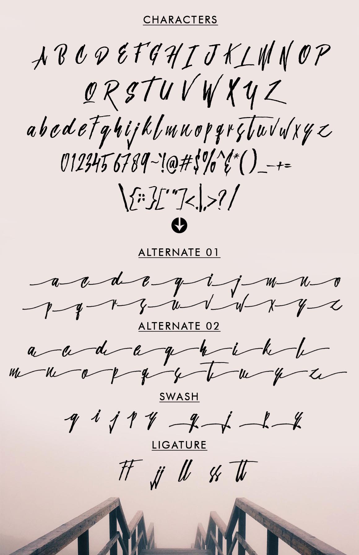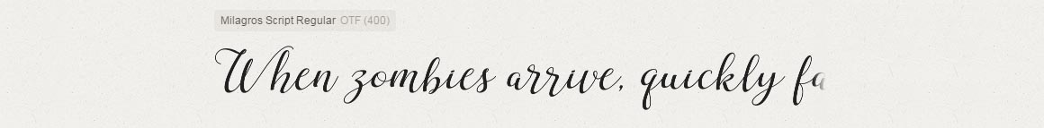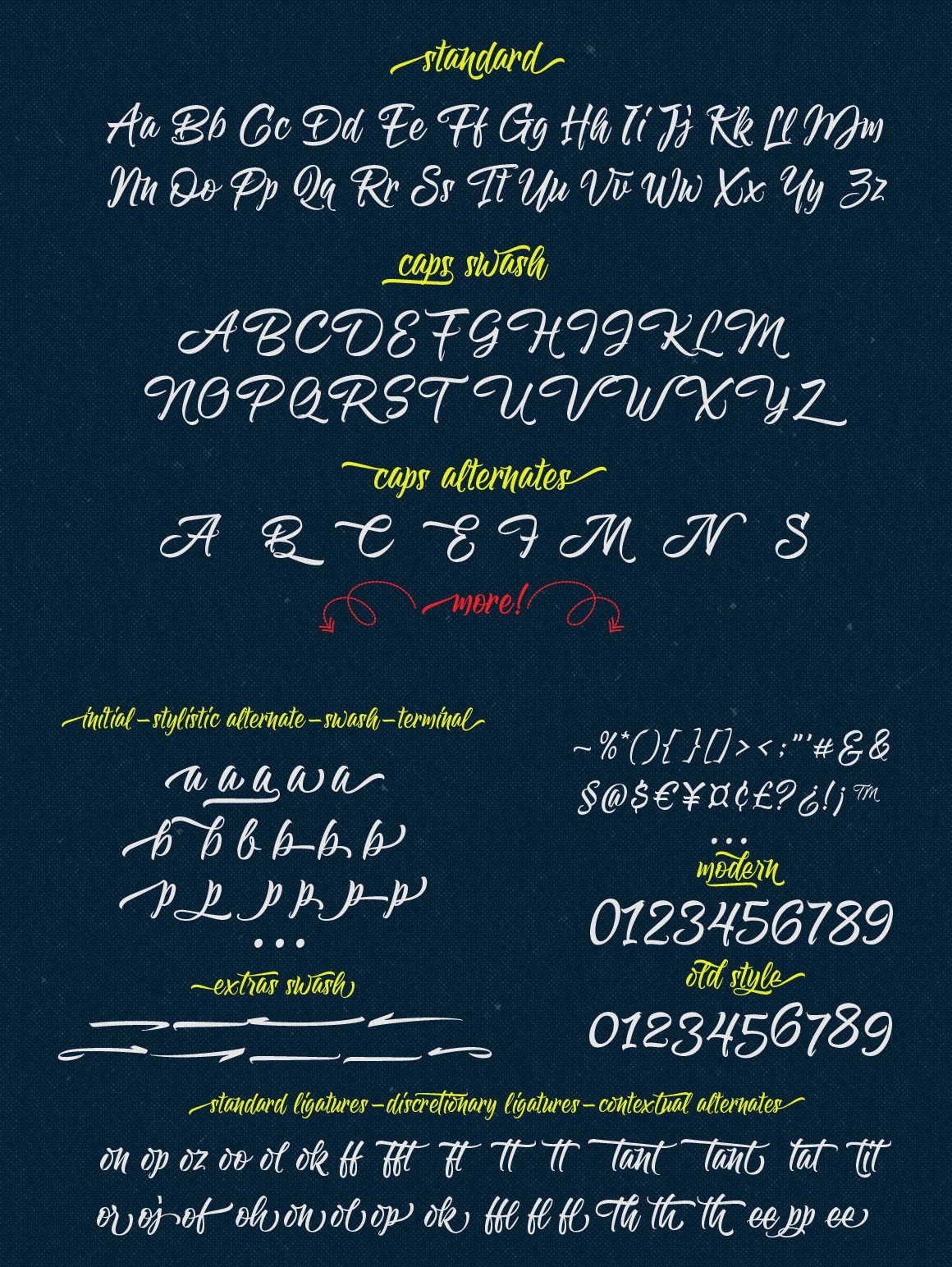 Milagros Script is handwritten stylish modern calligraphy fonts, combines from copperplate to contemporary typeface with a dancing baseline, modern and elegant touch. Can be used for various purposes.such as headings, signature, logos, wedding invitation, t-shirt, letterhead, signage, label, news, posters, badges etc. Milagros Script features 400+ glyphs and 241 alternate characters. Including initial and terminal letters, alternates, ligatures and multiple language support.