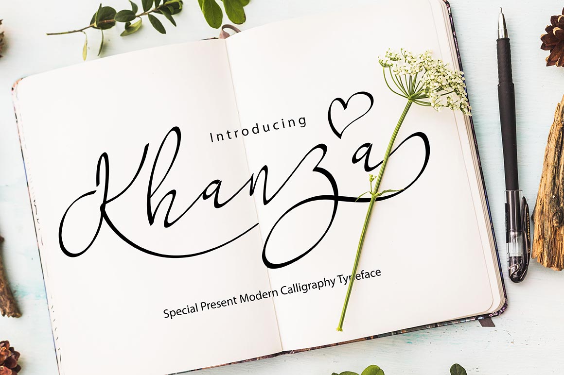 Khanza Script is a hand drawn typeface combined with a simply between glyphs and beautiful, can be used as the title, signature, logo, correspondence, wedding invitations, letterhead, signage, labels, newsletters, posters, badges, etc.