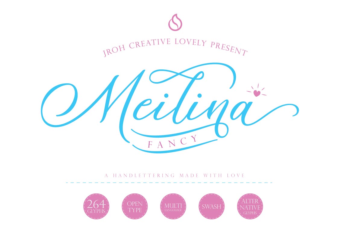 Hi….let me introduce the Meilina Fancy, this font was created with love to help you designing your lovely artworks such as wedding invitation, greeting card, merchandise, t-shirt, etc. The Meilina Fancy was designed for personal characters such as love, soft, dynamic, readable, etc. TradeMark containing 264 Glyphs with the alternative characters to improve your design.