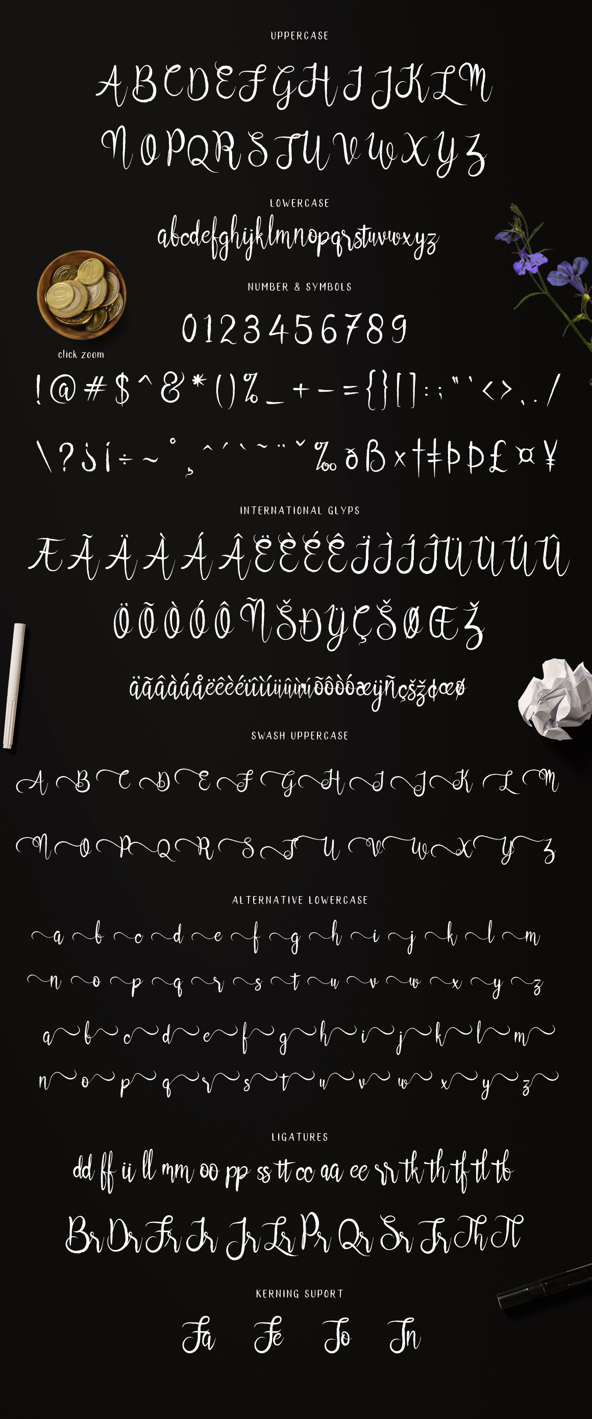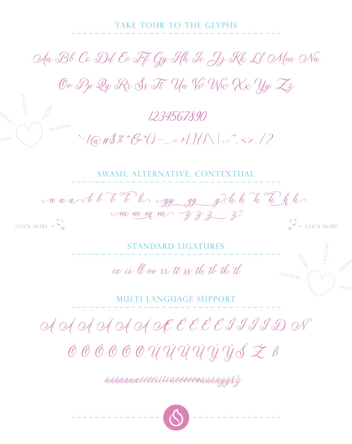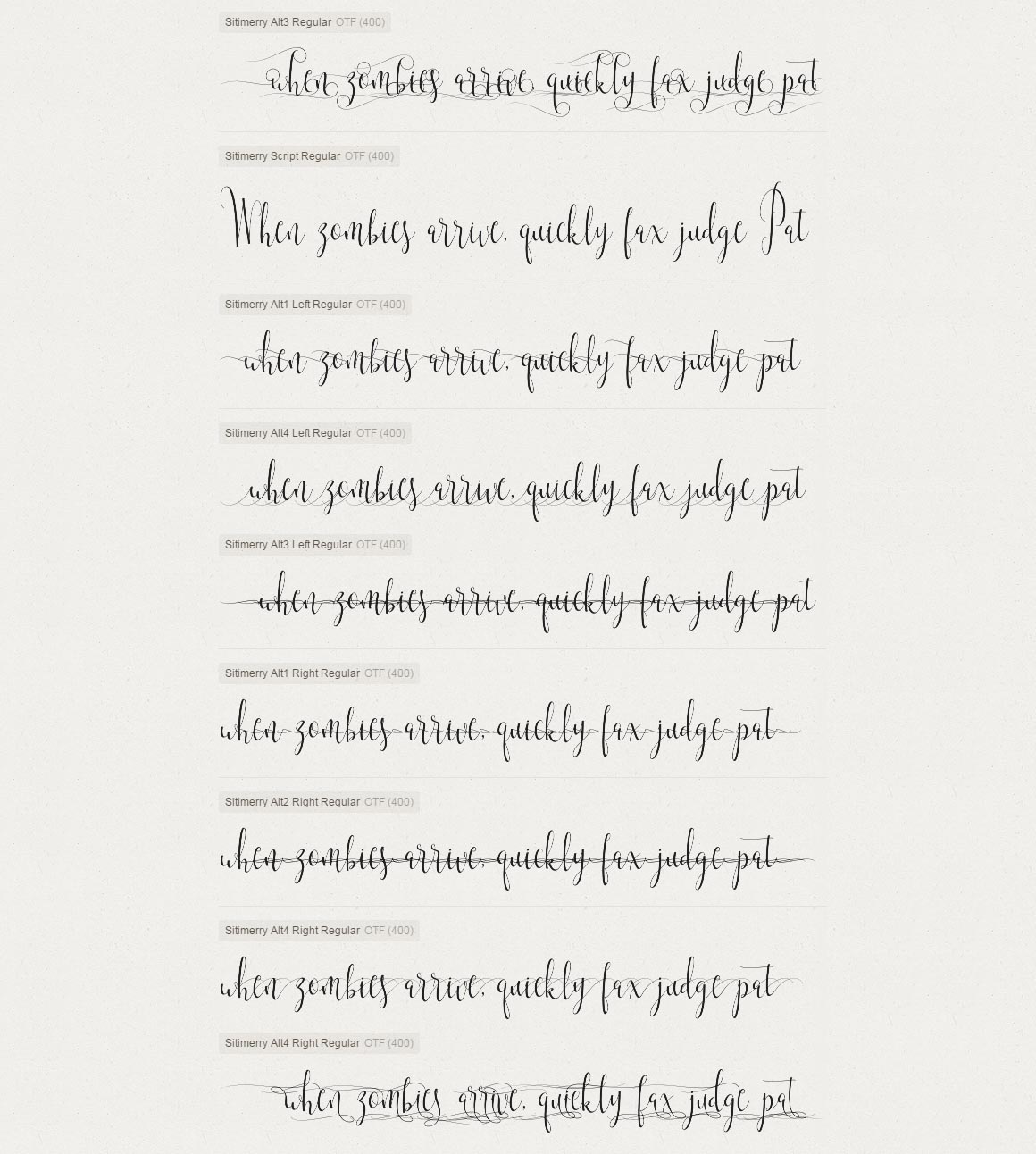 Pulsating movement and in line with your life, this is the sacrifice I made by hand is soft and smooth shape dazzling and I could stare at it for hours. Thin and beautiful like modeling on the cover of magazine, any clothing / costume worn still look pretty and beautiful too alluring Heart. Really captivate the audience shouted and I love you and that I made Sitimerry Script Inspiration. Suitable for the needs of design, modern design, Gift Cards, Invitations, Wedding, Special Occasion, Branding, Stationery Design, Advertising Design, and a variety of other needs. Do not worry if some of the software does not support the alternatives, but if you use Open Type Savvy software that has Glyph Panel, you can install Sitimerry Script.otf only, and you can access the swashes letters on Glyph Panel. And you can install all the font files and Access all the alternatives that exist in Sitimerry Script by selecting the text and then change through the Font drop down menu.