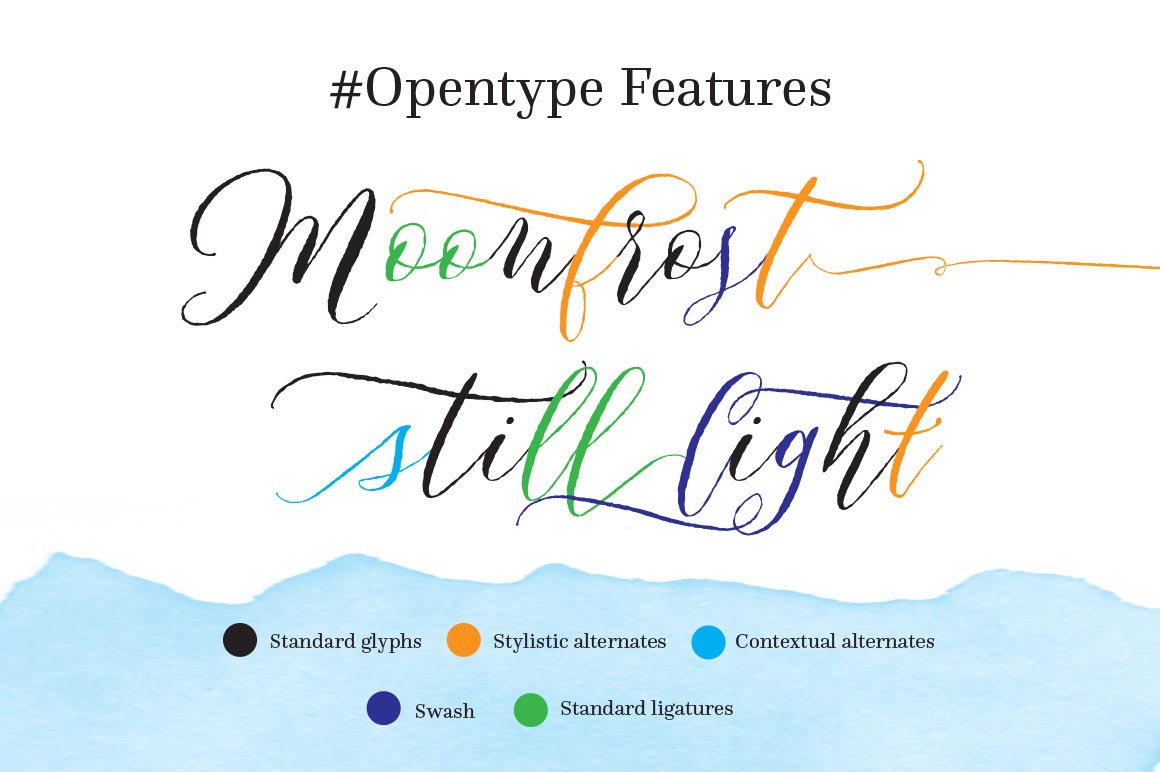 Is hand lettering typeface, modern style smooth with the rough effect from the cold in winter weather.Moonfrostcan used for various product design such as the title, signature, logo, correspondence, wedding invitations, letterhead, signage, labels, newsletters, posters, badges, etc. Moonfrost features 444 glyphs and has given PUA unicode (specially coded fonts), with tons of alternate characters. The pack can be accessed in full by any crafter or designer, without the requirement for extra design software. You can get all the glyphs by The Glyphs Panel. Available for: Adobe Illustrator, Adobe InDesign,Adobe Photoshop CC (latest version), Microsoft Word 2011.