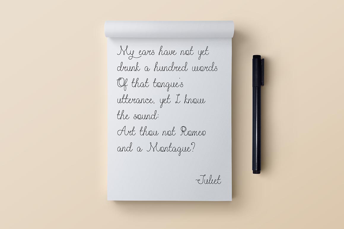 Honeymoon Script is a typeface that experiences adopting two building models: the typographic (with repetition of shapes) and the script (with the freedom of writing). The models are presented in a subtle, unobtrusive way and mainly without conflicts. The essence of each personality is present, coexisting harmoniously and enjoying the same stylistic space.