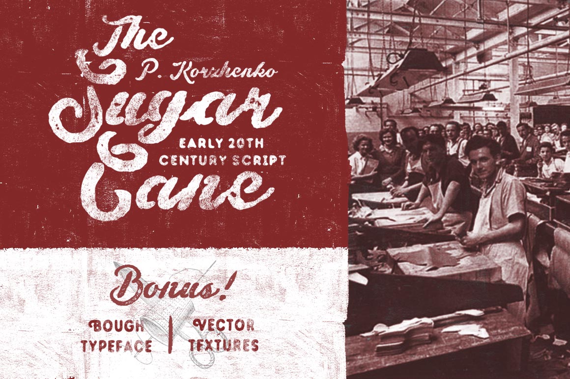 The Sugar Cane is a vintage script inspired by retro graphics from early 20th century clothing and shoe factory’s logo. This font gives you 100% vintage look styles. Works great applied to logos, prints, quotes, magazine headers, clothing… actually most applications!